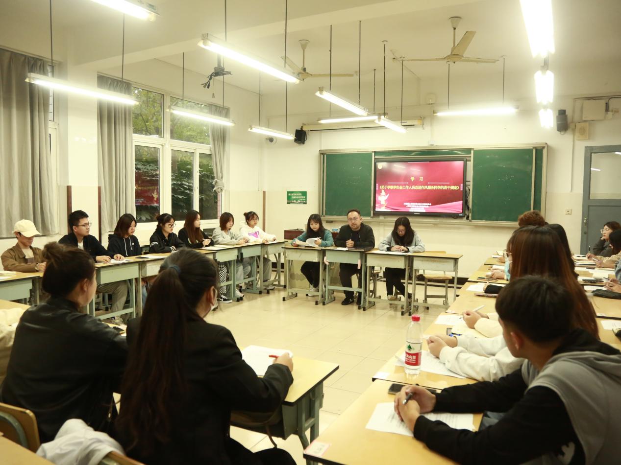 10月19日,在第一教学楼110教室,院团委组织院系新换届学生骨干30余人专题学习《关于学联学生会工作人员改进作风服务同学的若干规定》,团委书记胡慧春主持学习会,逐条研读文件并提具体要求。