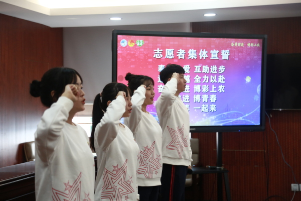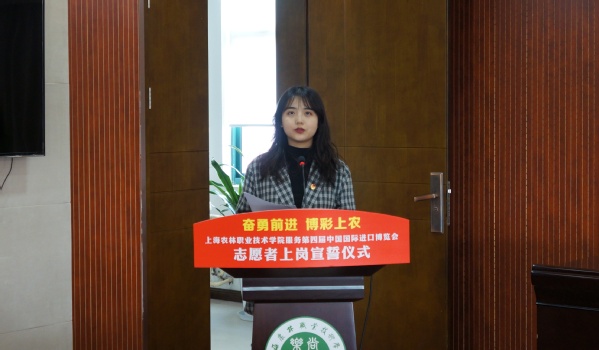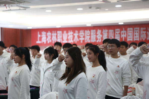 会上,党委学工部部长沈悦为志愿者代表赠送装备,团委书记胡慧春为志愿者服务队临时团支部授牌,带队教师介绍了志愿者前期招募及筹备情况。志愿者代表原创情景讲述《进博三问》,用“三问”来回答志愿者的初心。最后全体志愿者用最真诚、最响亮的青春之声庄严宣誓:奉献友爱、互助进步;追求卓越、全力以赴;奋勇前进、博彩上农;向前进、博青春;为进博、一起来,充分表达了上农“小叶子”践行志愿精神、全心为第四届进博会奉献的信心与决心。