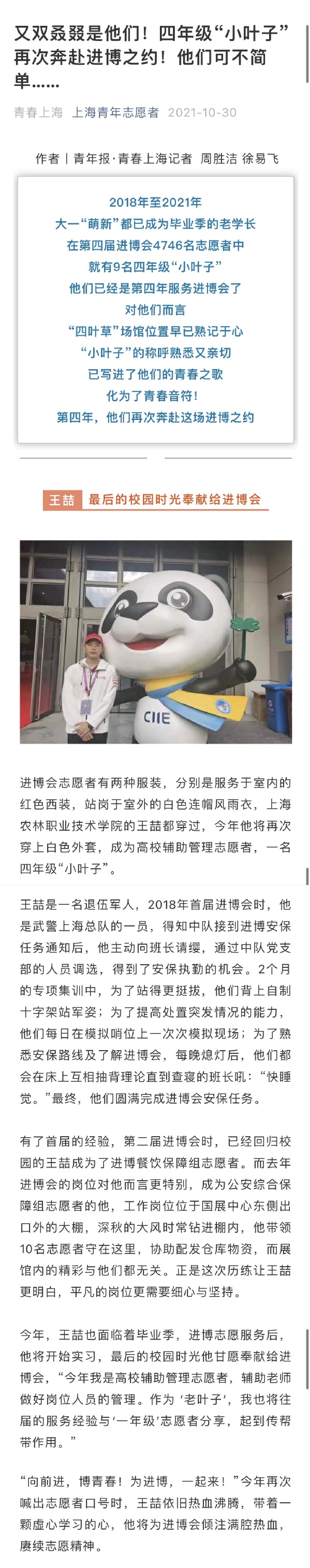 近日,上海青年志愿者微信公众号号报道了学院“小叶子”王喆连续四年志愿服务进博会事迹。报道全文如下: