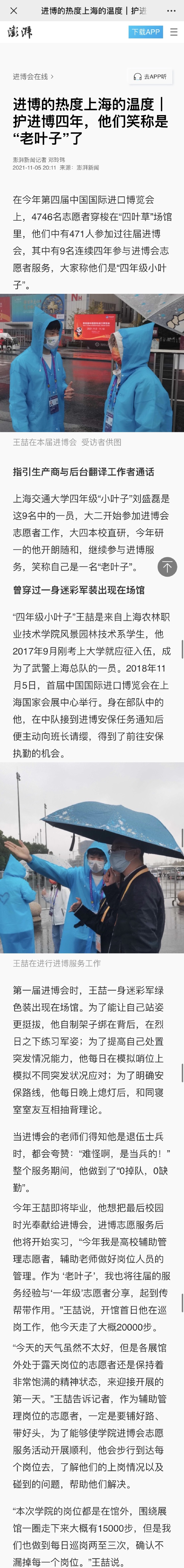 近日,澎湃新闻报道学院“小叶子”王喆连续四年志愿服务进博会事迹。全文如下: