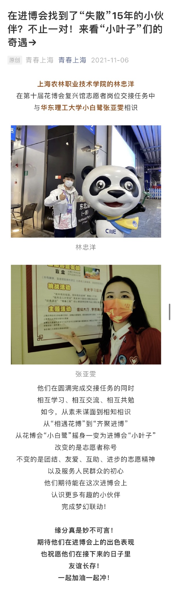 上海农林职业技术学院的林忠洋在第十届花博会复兴馆志愿者岗位交接任务中与华东理工大学小白鹭张亚雯相识,他们在圆满完成交接任务的同时相互学习、相互交流、相互共勉。如今,从素未谋面到相知相识从“相遇花博”到“齐聚进博”从花博会“小白鹭”摇身一变为进博会“小叶子”改变的是志愿者称号不变的是团结、友爱、互助、进步的志愿精神以及服务人民群众的初心他们期待能在这次进博会上认识更多有趣的小伙伴完成梦幻联动!缘分真是妙不可言!期待他们在进博会上的出色表现也祝愿他们在接下来的日子里友谊长存!一起加油一起冲!