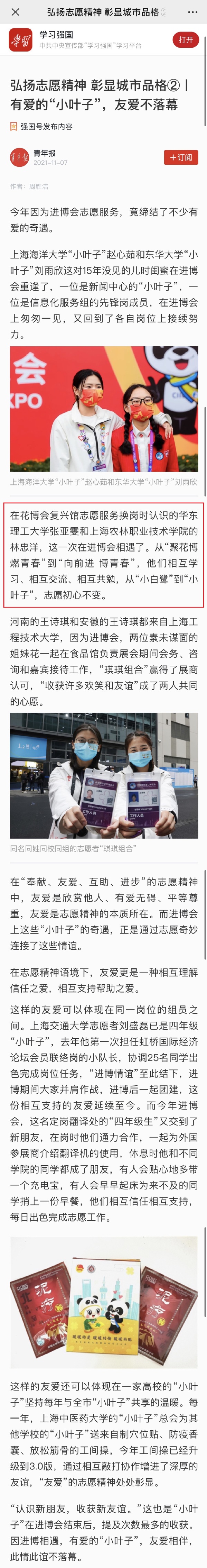 近日,学习强国、青春上海微信公众号报道了学院“小叶子”林忠洋进博会志愿服务事迹。全文如下:
