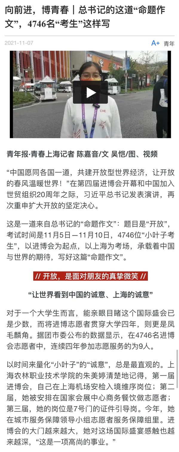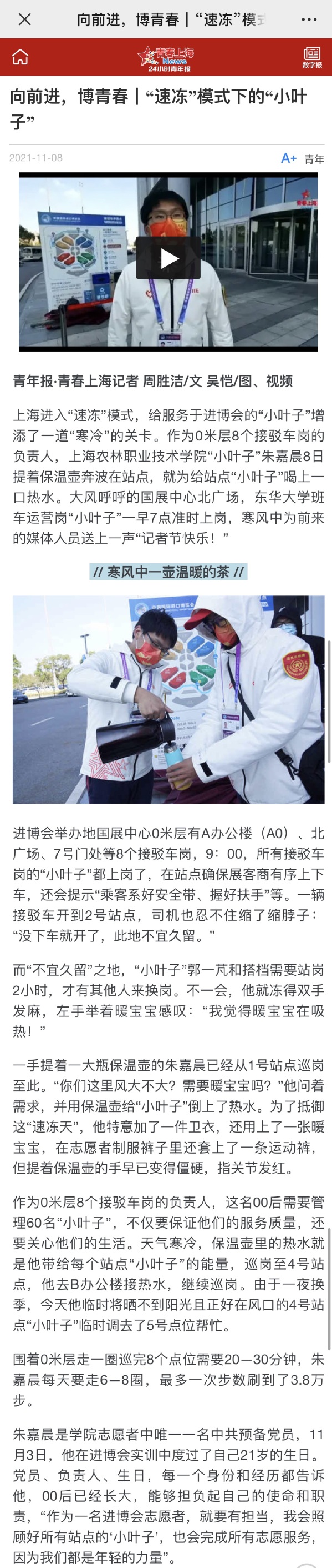近日,青春上海news——24小时青年报报道了学院2名进博会“小叶子”志愿服务事迹。她们分别是连续四年参与进博会志愿服务的朱美婷,0米层8个接驳车岗的负责人朱嘉晨。报道全文如下: