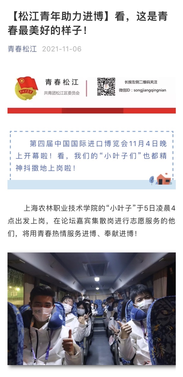 近日,青春上海公众号、青春松江微信公众号报道我院进博会志愿服务事迹。报道全文如下: