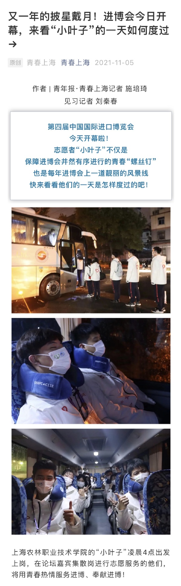 上海农林职业技术学院的“小叶子”凌晨4点出发上岗,在论坛嘉宾集散岗进行志愿服务的他们,将用青春热情服务进博、奉献进博!