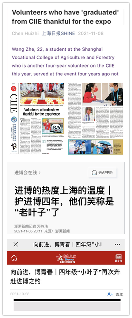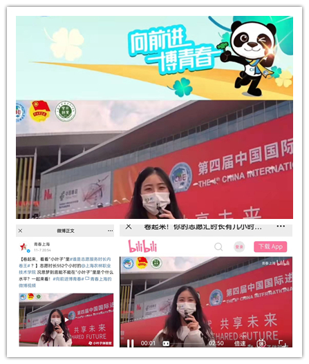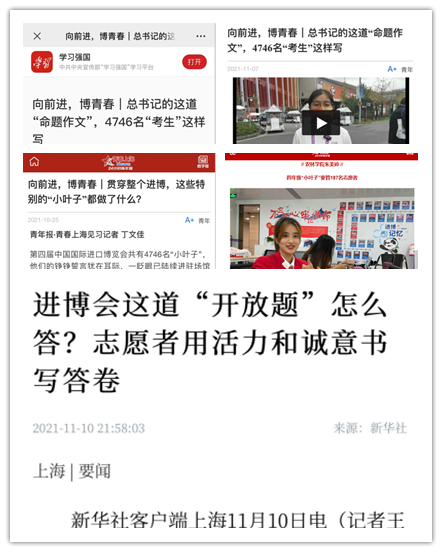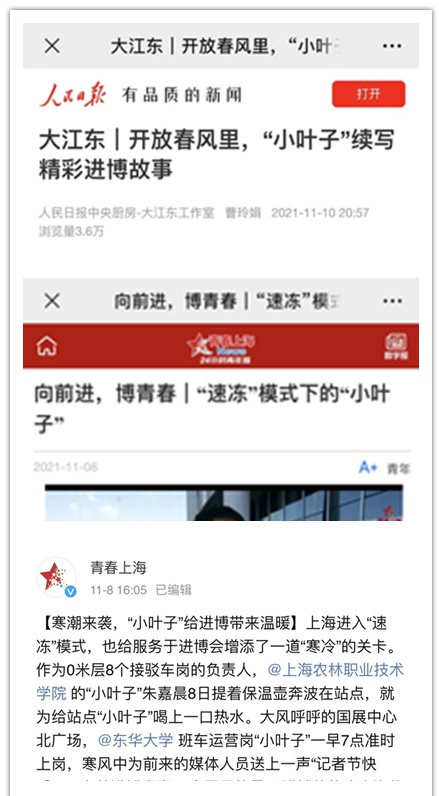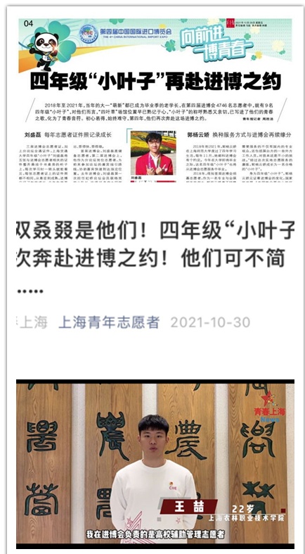 在志愿服务第四届中国国际进口博览会的过程中,学院116名上农“小叶子”也成为众多媒体镜头中的C位,他们,优秀事迹也受到了新华社、人民日报、学习强国、上海日报、澎湃新闻、青年报、青春上海、上海青年志愿者、青春松江等数10家媒体平台23次报道宣传, 让我们一起来看看上农“小叶子”的故事!