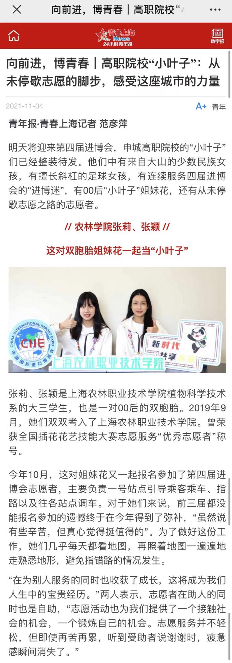 “一年级小叶子”张莉、张颖,来自植物科学技术系,是一对00后的双胞胎。今年10月,这对姐妹花又一起报名参加了第四届进博会志愿者,主要负责一号站点引导乘客乘车、指路以及往各站点调车。对于她们来说,前三届都没能报名参加的遗憾终于在今年得到了弥补,“虽然说有些辛苦,但真心觉得挺值得的”。为了做好这份工作,她们几乎每天都看地图,再照着地图一遍遍地走熟悉地形,避免指错路的情况发生,两人表示,志愿者在助人的同时也是自助,“志愿活动也为我们提供了一个接触社会的机会,一个锻炼自己的机会。志愿服务并不轻松,但即使再苦再累,听到受助者说谢谢时,疲惫感瞬间消失了。”