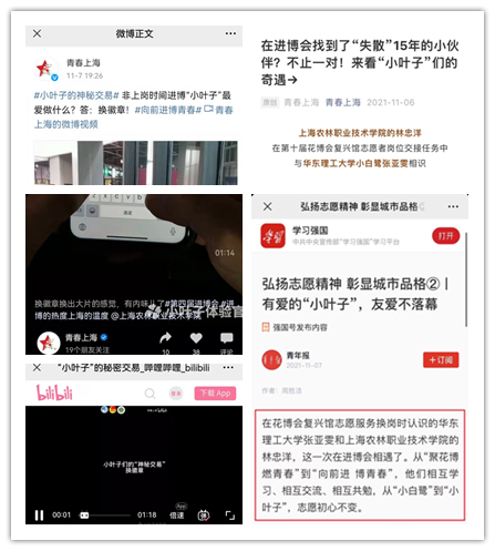 “二年级小叶子”林忠洋,来自风景园林技术系。在上半年花博会复兴馆志愿服务换岗时认识了华东理工大学张亚雯,这一次在进博会又相遇了。从“聚花博 燃青春”到“向前进 博青春”,他们相互学习、相互交流、相互共勉,从“小白鹭”到“小叶子”,志愿初心不变。今年的他还作为“小叶子体验官”的一员,参与拍摄多个短视频,他的事迹及作品被学习强国和青春上海的多个新媒体品台报道。