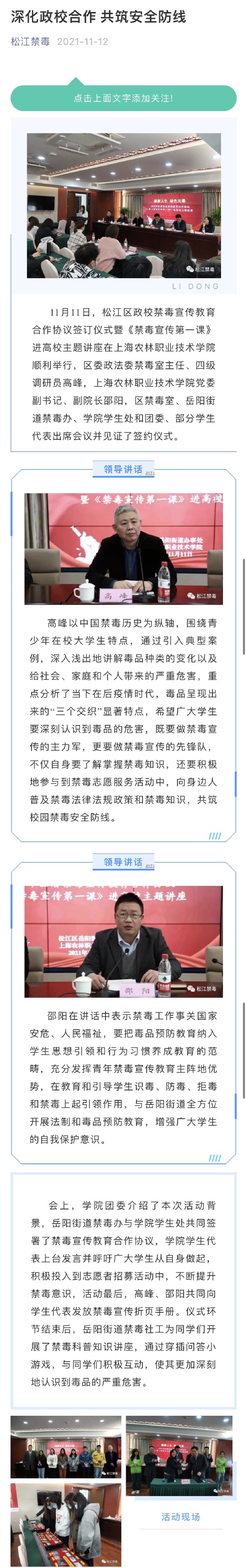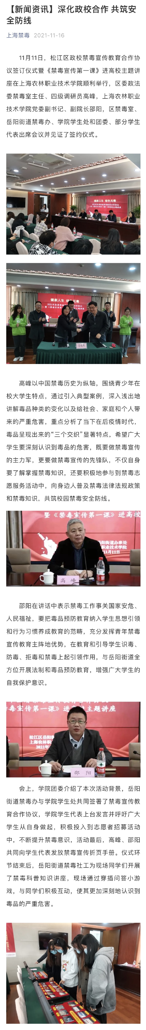 近日,由松江区政法委禁毒室指导,学院与岳阳街道联合举办“健康人生 绿色无毒”2021年禁毒科普知识宣讲暨签约仪式我院顺利举行,上海禁毒、松江禁毒微信公众号对活动进行报道,报道全文如下: