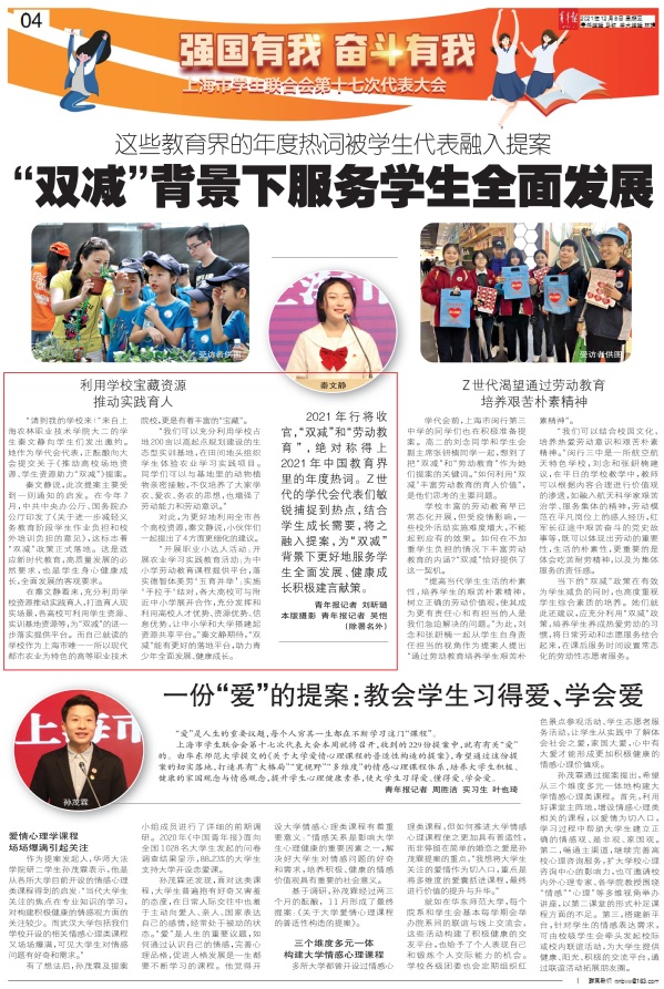 2021年行将收官,“双减”和“劳动教育”,绝对称得上2021年中国教育界里的年度热词。Z世代的学代会代表们敏锐捕捉到热点,结合学生成长需要,将之融入提案,为“双减”背景下更好地服务学生全面发展、健康成长积极建言献策。
