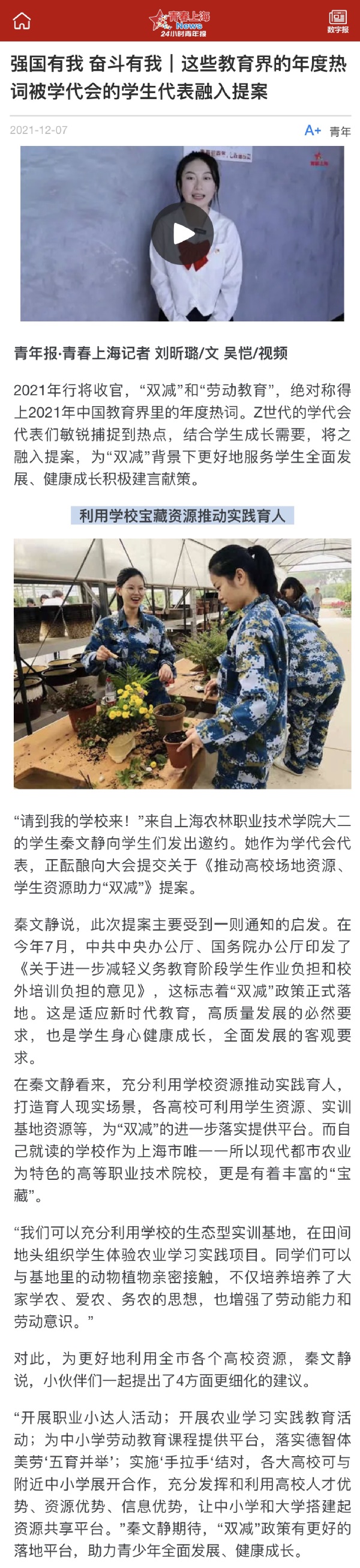 “请到我的学校来!”来自上海农林职业技术学院大二的学生秦文静向学生们发出邀约。她作为学代会代表,正酝酿向大会提交关于《推动高校场地资源、学生资源助力“双减”》提案。