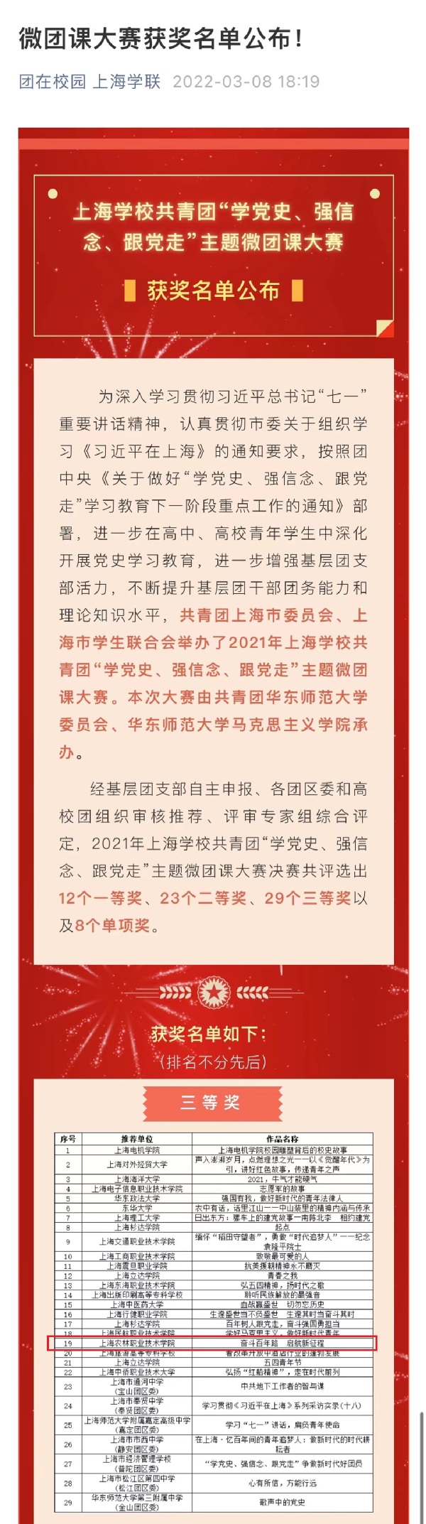 近日,由共青团上海市委员会、上海市学生联合会联合举办的2021年上海学校共青团“学党史、强信念、跟党走”主题微团课大赛落下帷幕。在全市187件优秀作品中,我院上农青年讲师团成员、旅管201班李美静同学的作品《奋斗百年路 启航新征程》荣获三等奖。