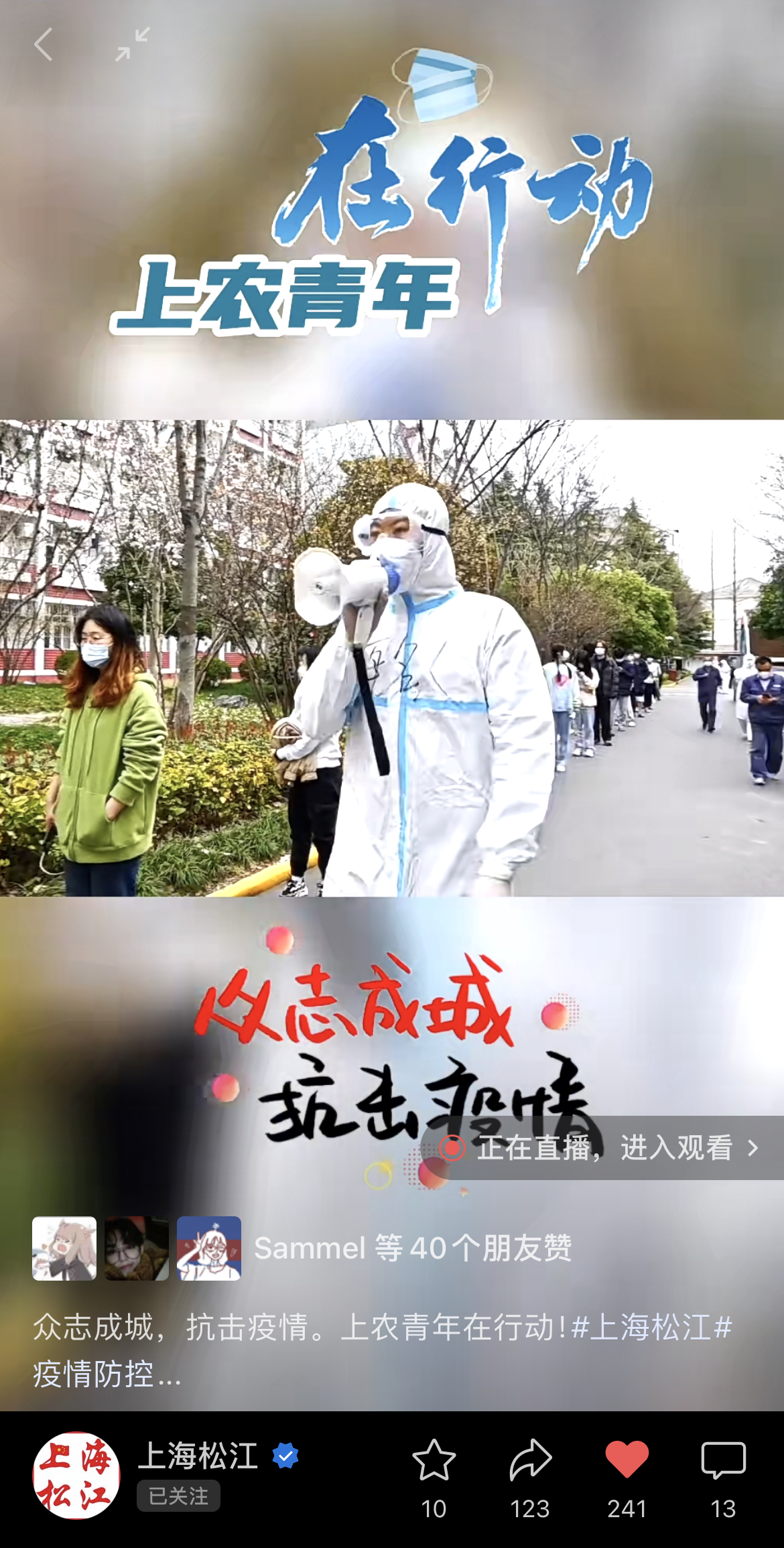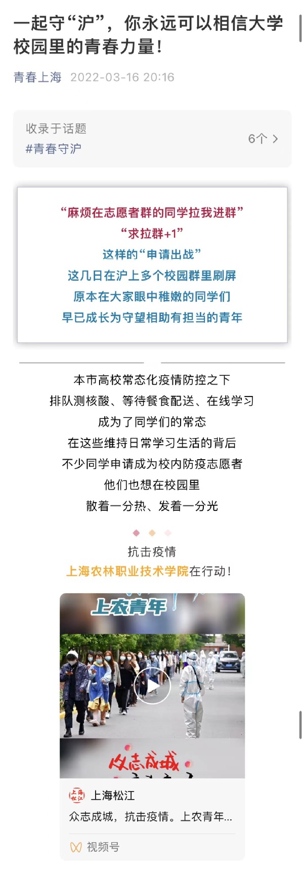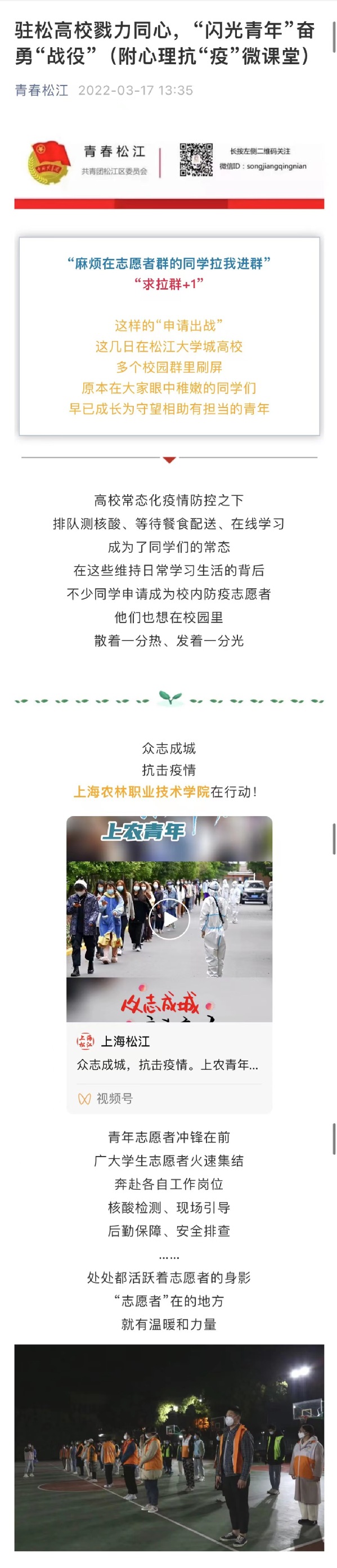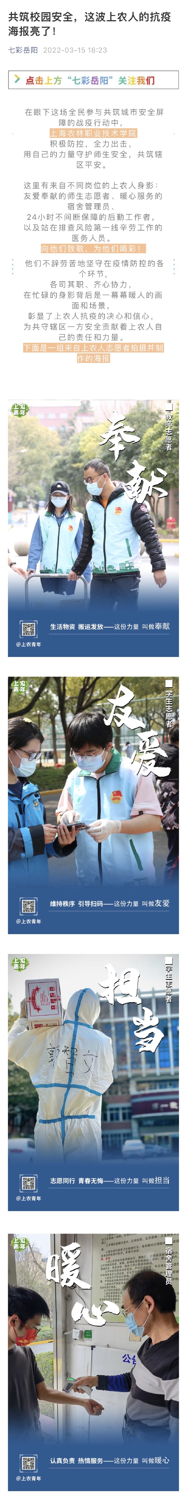 近日,青春上海微信公众号、上海松江视频号、青春松江、七彩岳阳微信公众号报道上农青年志愿者参与学校疫情防控,全文如下:
