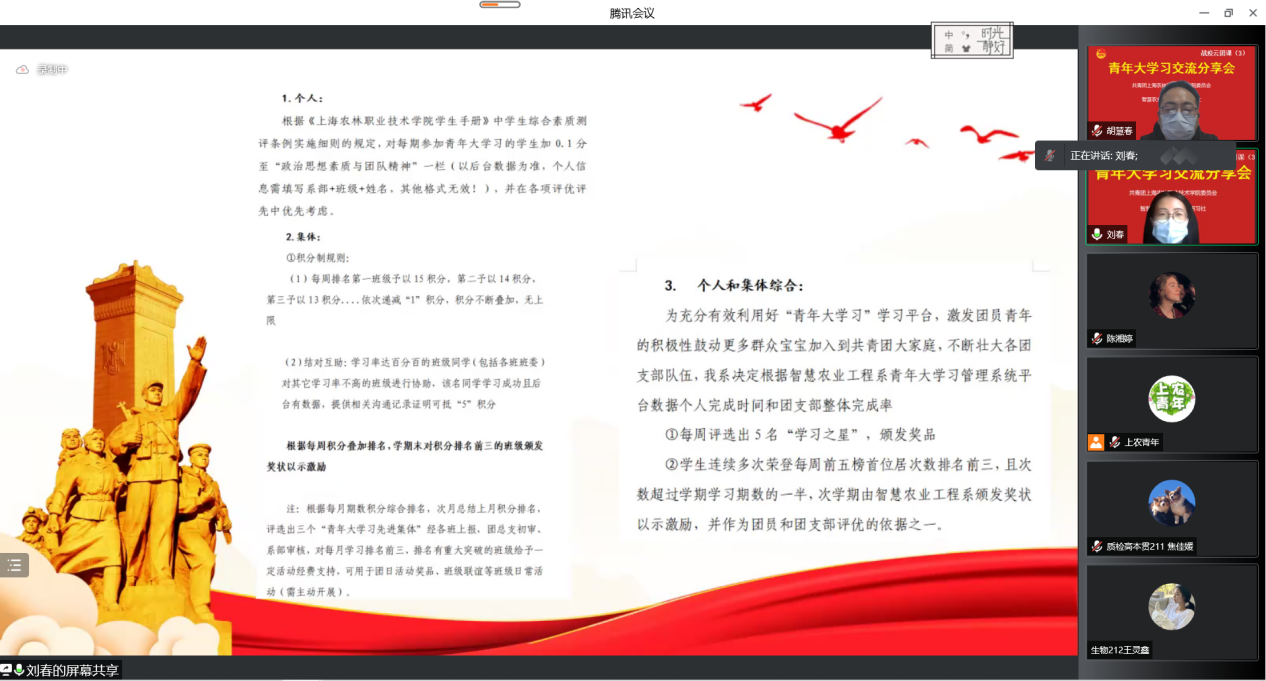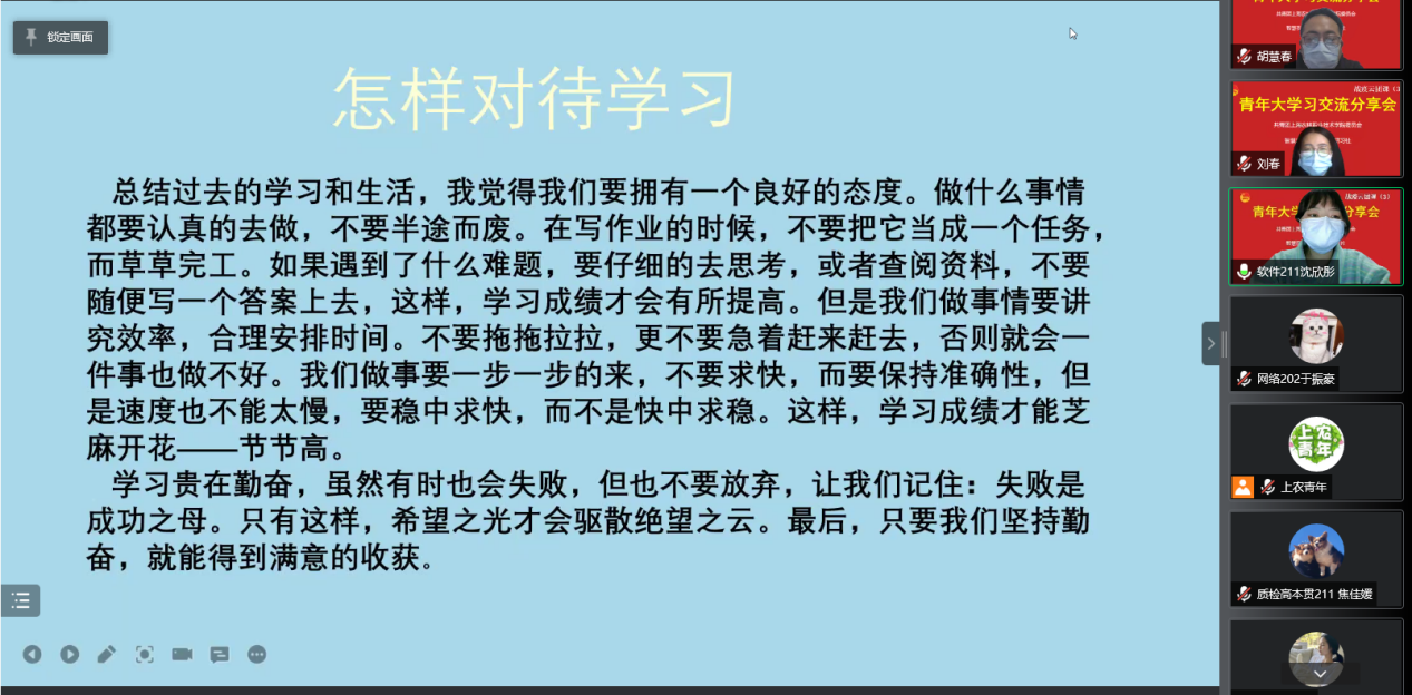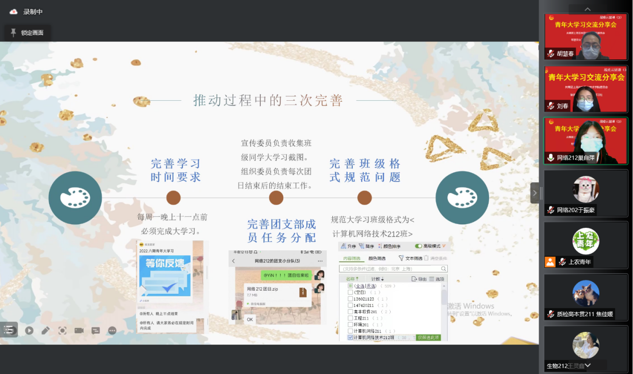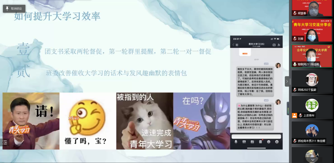 刘春老师表示,智工系高度重视青年大学习工作,建立并完善一系列动员组织和考核激励机制,即党总支指导、团总支督促、团支部积极行动,根据每期学习的要求,细化时间节点工作安排,系部团员青年学习主动性不断增强,取得明显学习成效。团总支副书记、网络201赵明婧表示要不断加强毕业生团员的参与度,借鉴好的工作经验,让团员青年更好地学习党的理论与主张。学习之星代表网络201班金慈恩、软件211班沈欣彤结合自身学习情况以及对“青年大学习”的认识等方面表示要继续加强理论学习,将“青年大学习”的思想与内涵融入到个人的勤学强技实践中,不断做好表率。物联网211班周佳莉和网络212班巢自萍代表先进班集体在分享时表示,各班要不断完善激励和考核制度,调动团支部积极性,从而不断激发团支部竞争意识,提升活力。