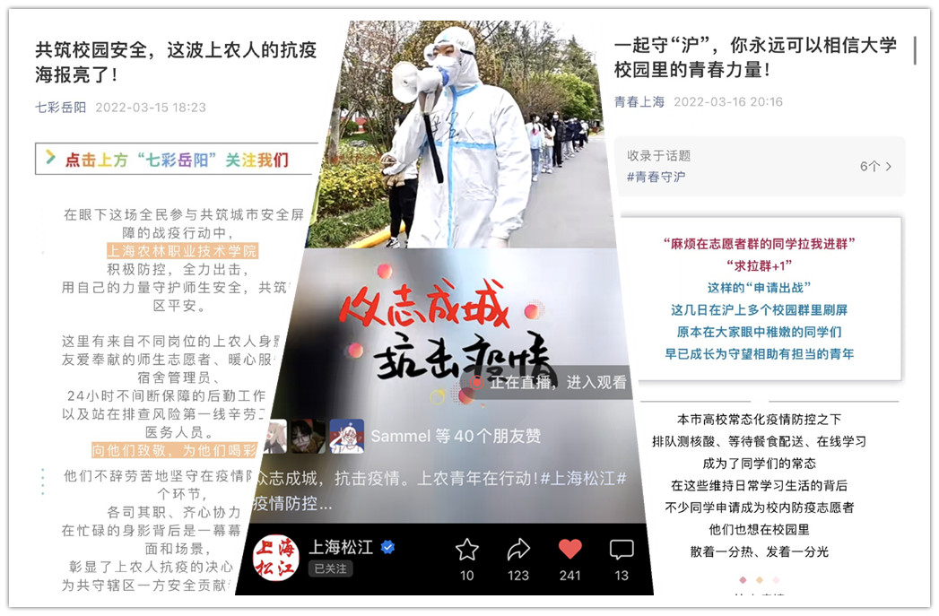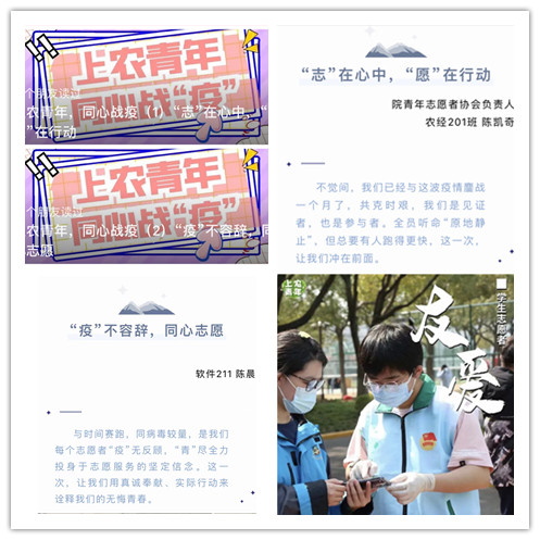 党旗所指就是团期所向。院团委积极贯彻落实院党委、团市委关于疫情防控工作的部署,坚定不移地坚持“动态清零”总方针不动摇,将共青团思想育人、实践育人、文化育人、网络育人与服务疫情防控大局结合起来,为坚决打赢疫情防控攻坚战贡献青春力量。广大上农青年表示:坚持就是胜利,坚持才能胜利。在上海疫情防控处于全面打响社会面清零攻坚行动的关键时期,用“战疫必胜”的坚定信念和“战疫有我”的实际行动,彰显上农青年的风采与担当,让自己的青春在战疫大局中闪闪发光。