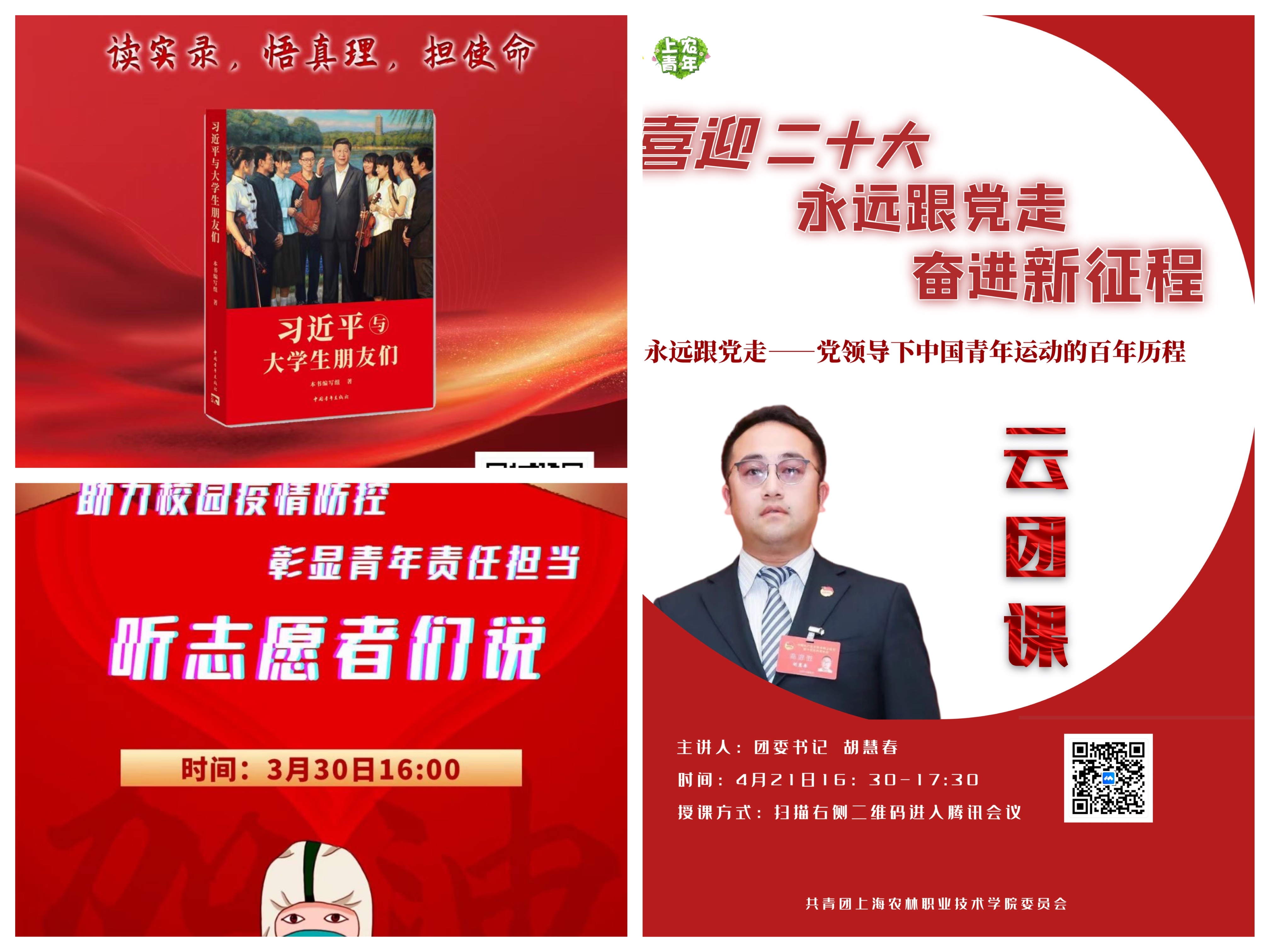3月—4月,院团委组织全院团支部围绕“德、智、体、美、劳”五育并举开展“校园抗疫情,上农青年在行动”“喜迎二十大、永远跟党走、奋进新征程”等线上主题系列活动,把同心抗疫、奋勇向前作为推进学生思想政治引领的重要实践,增强上农青年战胜疫情的信心。期间开展战疫云团课8期,把握疫情防控中的教育契机为青年学生注入“精神疫苗”;上农青年讲师团开展线上宣讲3次,加强正面引导、正向激励;各基层团支部开展主题云团日活动260余场,通过交流分享志愿心得,宣传推广防疫知识,线上分享战疫精神等,持续凝聚青年学生抗击疫情的青春力量。