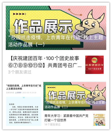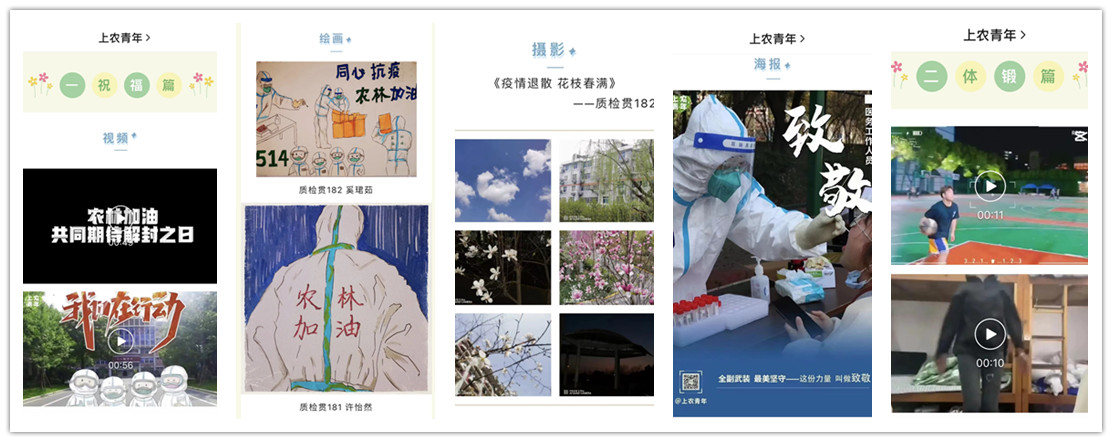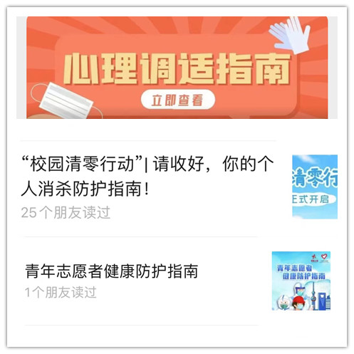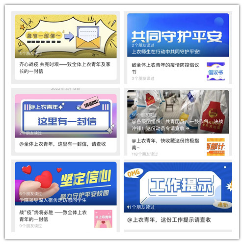 “上农青年”微信平台定期推送青年志愿者健康防护指南,个人消杀防护指南、核酸检查自我防护要点等内容,加强疫情防控教育,普及防疫知识,引导学生不信谣、不传谣、不造谣,为打赢疫情防控阻击战打下坚实思想基础。
