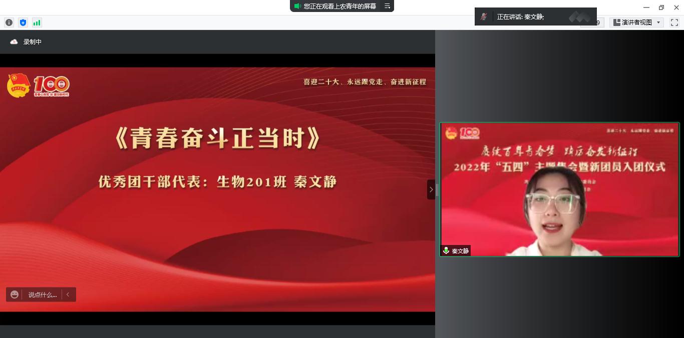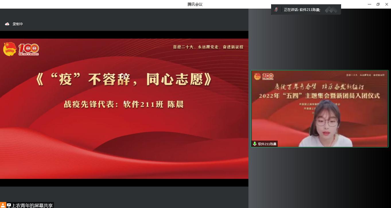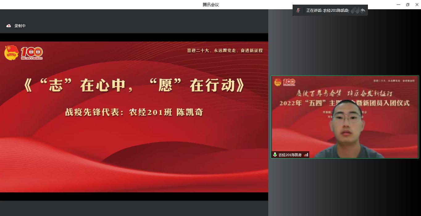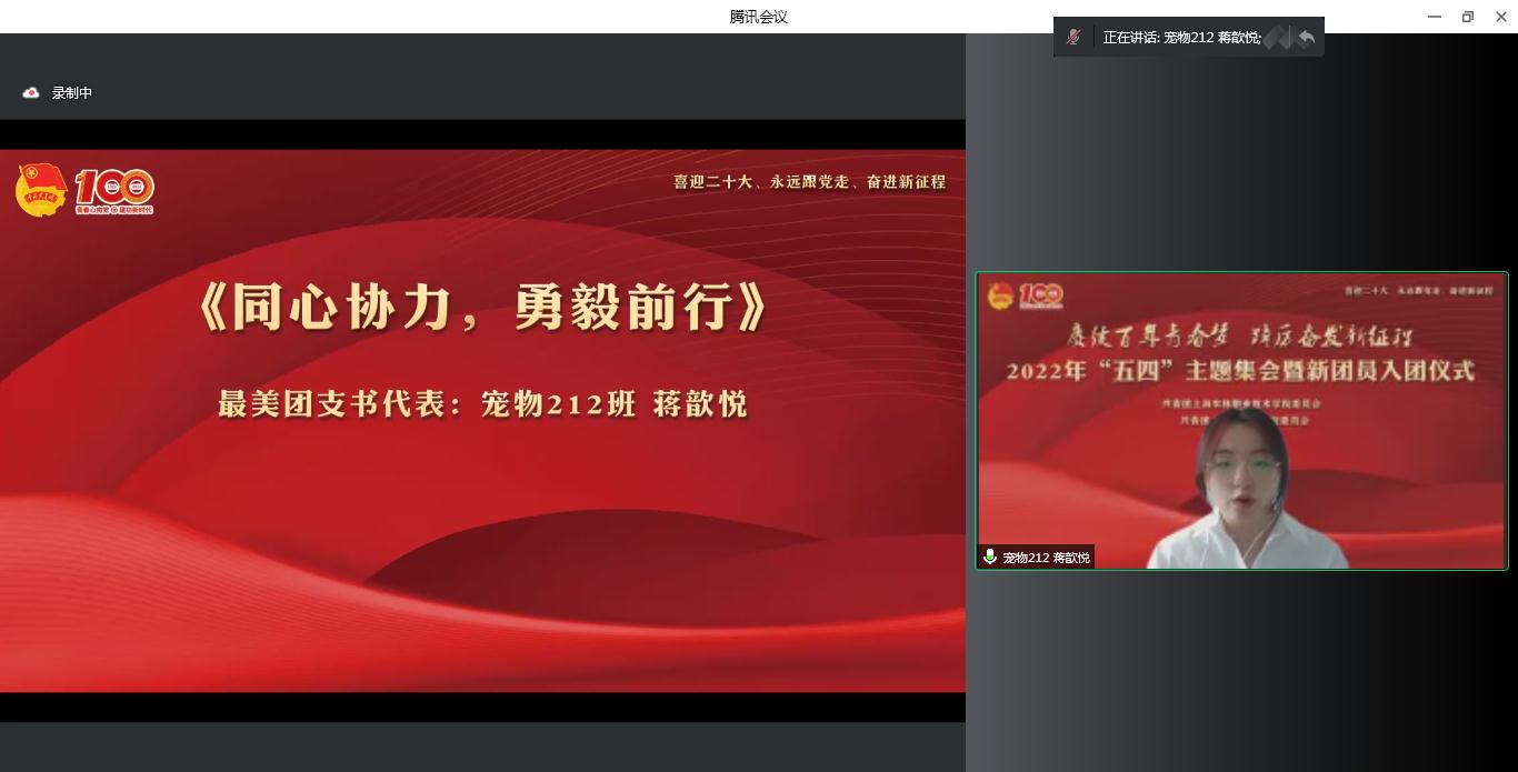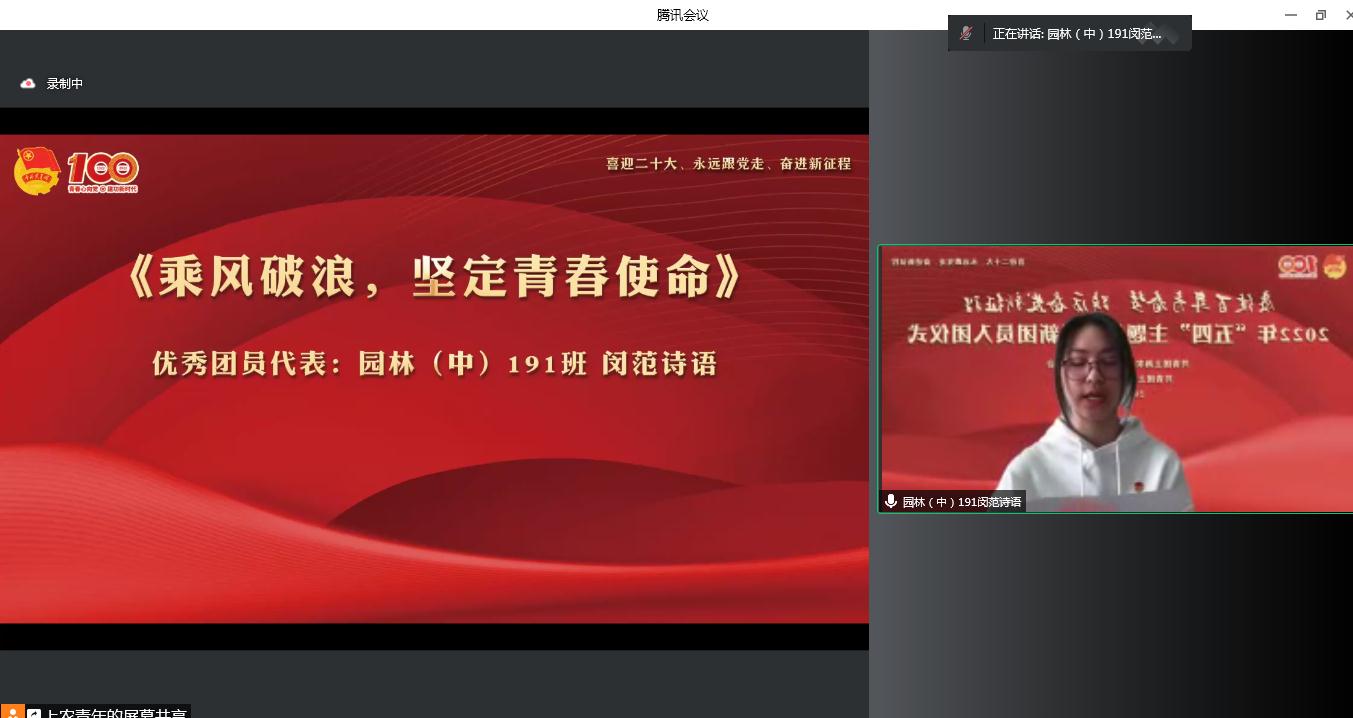 党委学工部部长沈悦宣读《关于2022年“五四”评优表彰的决定》,授予秦文静等69人“优秀团干部”称号,授予周旭磊等105人“优秀团员”称号,授予蒋歆悦等30人“最美团支书”称号,授予陈凯奇等433人“青年战疫先锋”称号,授予网络212班等21个团支部“先进团支部”称号,授予种子211班等21个团支部“活力团支部”称号。团委老师和各系获奖代表围绕共青团组织育人、实践育人、团支部建设、团学骨干成长、参与校园疫情防控志愿服务等方面进行交流发言。