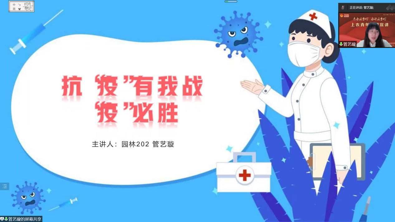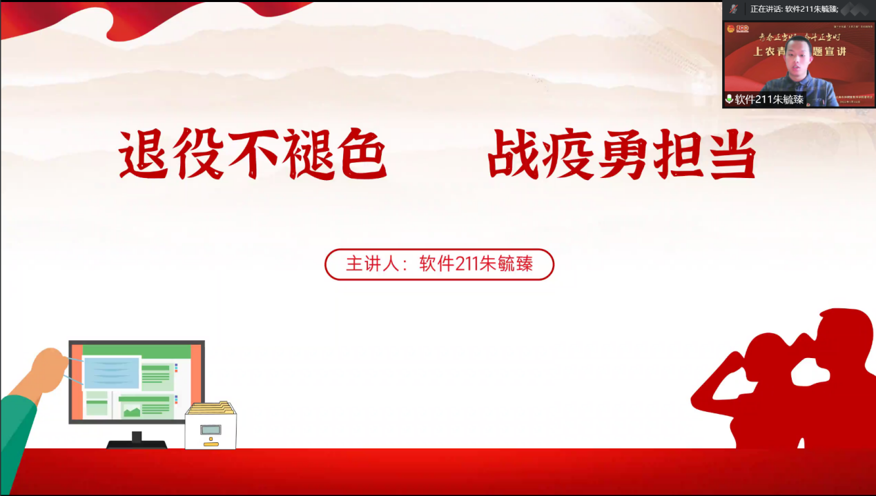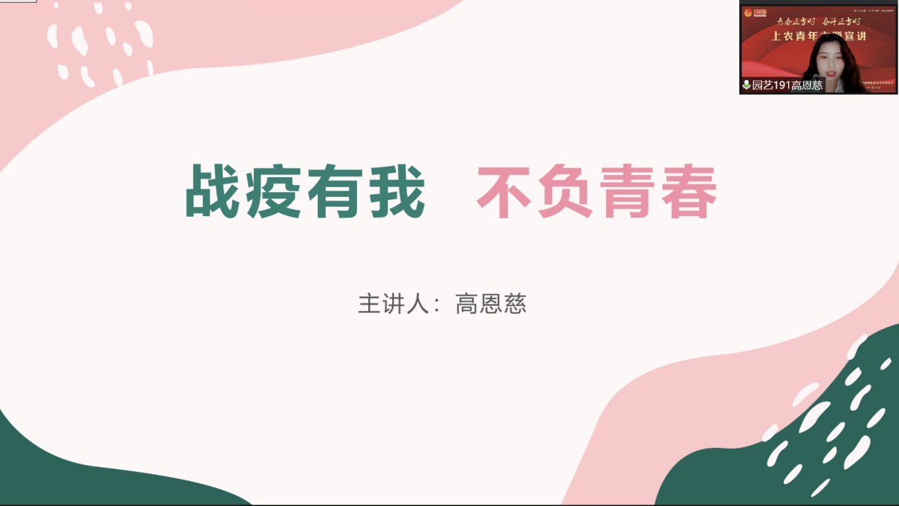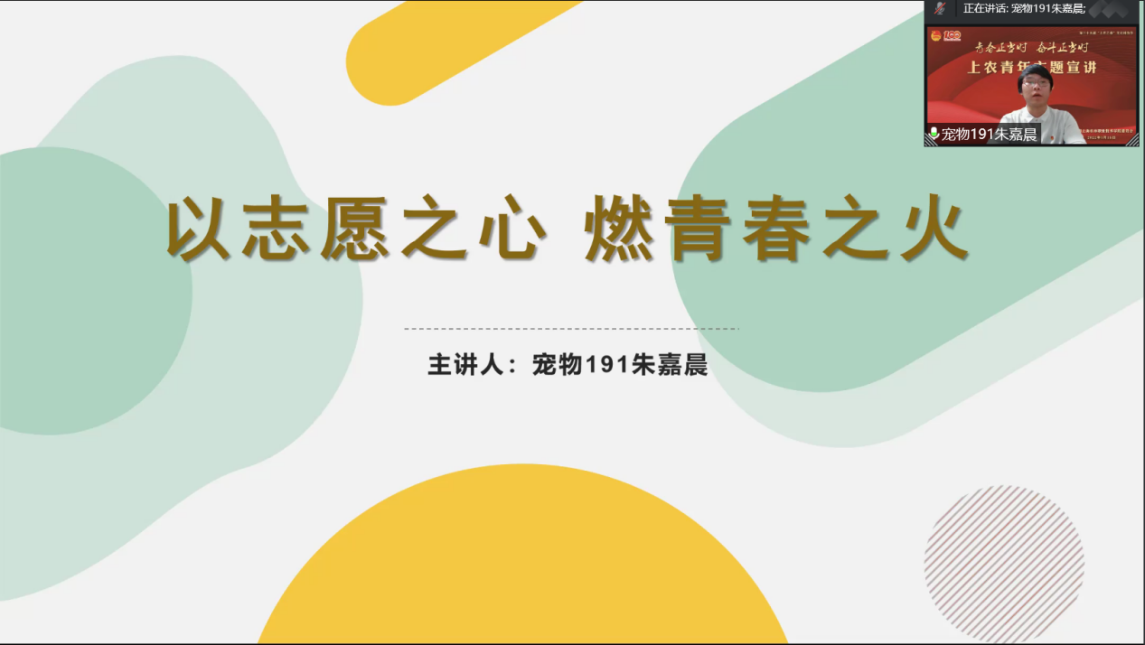 会上,来自上农青年讲师团7位成员依次开展宣讲,旅管191班姚丽春以《青春献礼二十大 上农青年在行动》为宣讲主题,她讲到:作为一名上农青年,我们要弘扬伟大建党精神,对“国之大者”领悟到位,始终在思想上、政治上、行动上同党中央保持高度一致。以史为鉴、开创未来,埋头苦干、砥砺前行,以信仰之光照亮前行之路,用如磐初心凝聚奋斗伟力,以实际行动迎接党的二十大胜利召开;宠物191班朱嘉晨以《以志愿之心,燃青春之火》为宣讲主题,他讲到:作为00后大学生,我们有能力也有信心接过时代的接力棒,青春是用来奋斗的,有责任有担当的青春才会闪闪发光;园艺191班高恩慈以《战“疫”有我 不负青春》为宣讲主题,她讲到:新时代青年要有属于自己青春斗志与使命,参与疫情防控志愿服务,迎接新挑战,青年再行动。让我们一起坚定理想信念,以饱满的激情,拥抱青春;旅管201班李美静以《以青春之我 贡献伟大时代——学习习近平总书记在庆祝中国共产主义青年团成立100周年大会的重要讲话精神》为宣讲主题,她讲到:百年来无数的革命先辈用青春筑写中华,为实现中华民族伟大复兴的征程上前赴后继,正值青春的我们应当勇担时代大任,厚植家国情怀,练就过硬本领,在实现中华民族伟大复兴的接力跑中,跑出我们的精彩;生物201班秦文静以《建团百年再出发 青年一起向未来》为宣讲主题,带领同学们重温了团的历史,回望百年前先辈的每一个足迹,都值得我们铭记学习榜样精神;园林202班管艺璇以《抗“疫”有我 战“疫”必胜》为宣讲主题,她讲到:能以青年学生喜闻乐见的方式弘扬积极健康的战疫正能量感到很自豪,希望能用充满正能量的视频文字体现青年视角下的青年担当、青年力量,一同用“战疫必胜”的坚定信念和“战疫有我”的实际行动,彰显上农青年的风采与担当;软件211班朱毓臻以《退役不褪色 战“疫”勇担当》为宣讲主题,他讲到:疫情就是命令、防控就是责任。作为一名退伍军人和入党积极分子,危难关头,我必须挺身而出,冲锋在前,发挥先锋模范带头作用,自觉承担社会责任,在奋斗中彰显青年一代的使命、担当。