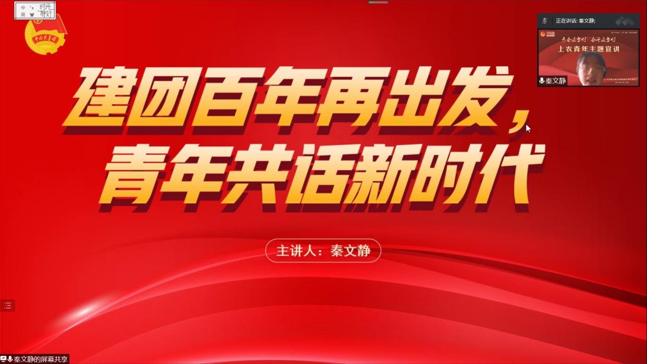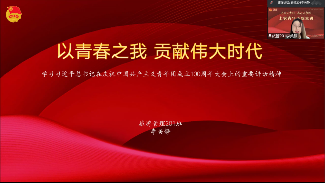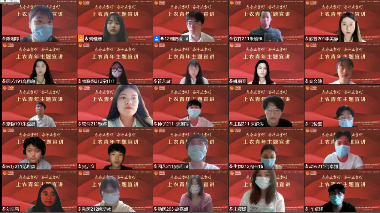 为庆祝中国共产主义青年团成立100周年,持续做好团员青年思想政治引领,引导全体团员青年学习贯彻习近平新时代中国特色社会主义思想,筑牢信仰根基,厚植爱党爱国情怀,5月15日,院团委组织开展“青春正当时,奋斗正当时”上农青年主题宣讲,宣讲通过腾讯会议进行,200余名团员青年在线参加。