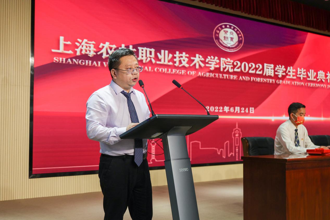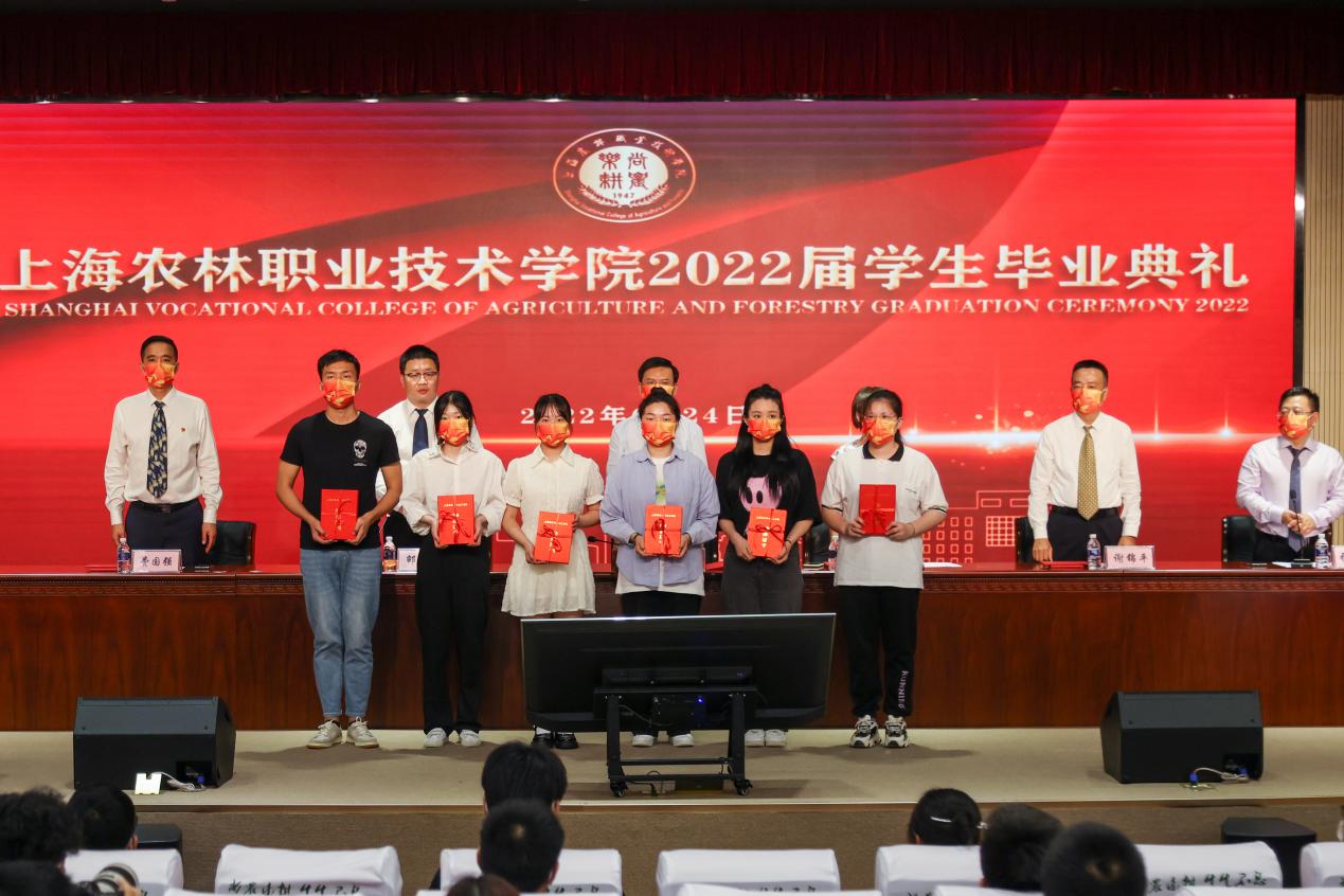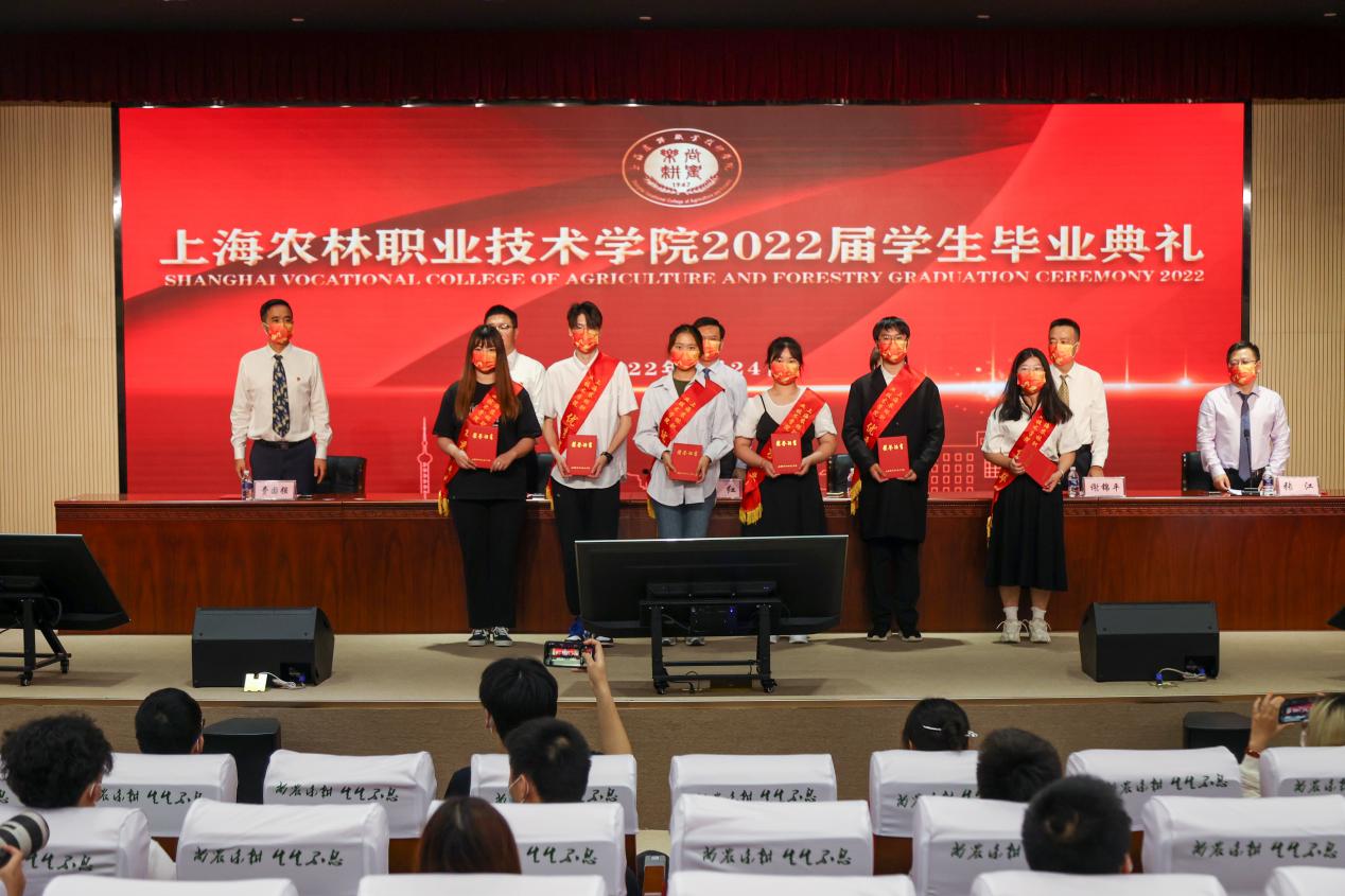 党委副书记陈谊宣读《上海农林职业技术学院2022年度优秀毕业生和2022年度上海市优秀毕业生表彰决定》,副院长张江宣读《上海农林职业技术学院关于准予2022届毕业生毕业的决定》,党政领导现场颁发上海市高校优秀毕业生、学院优秀毕业生和学生毕业证书。