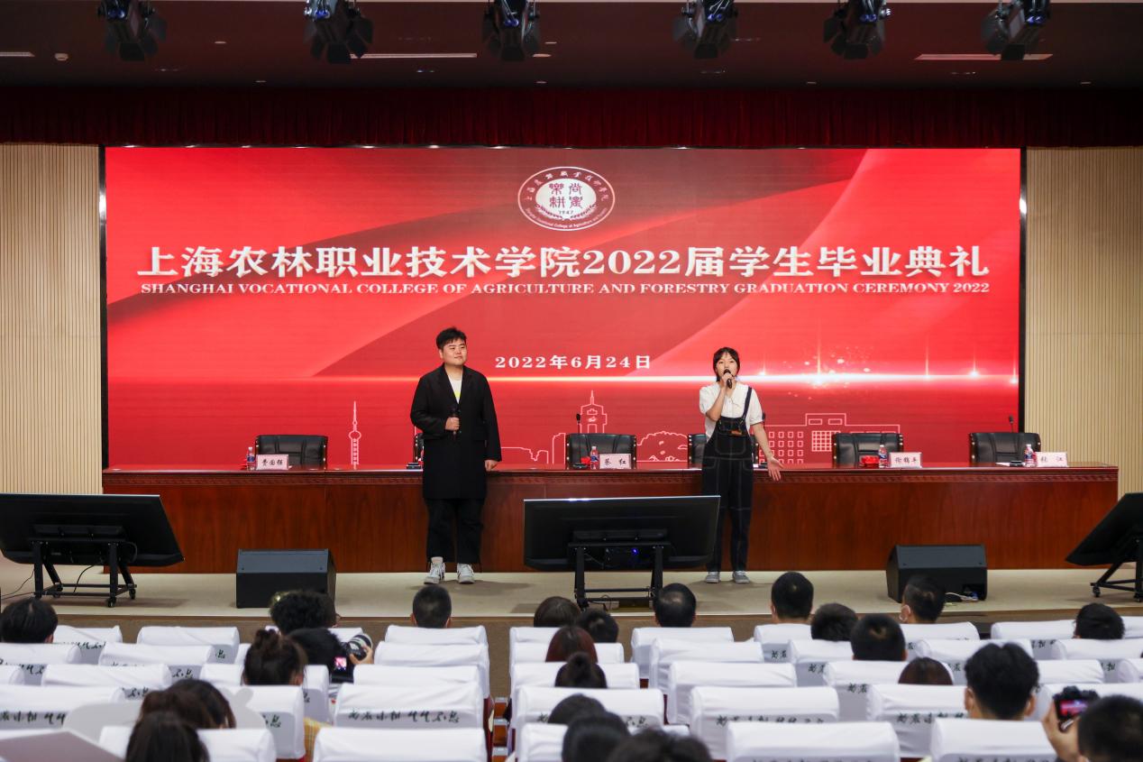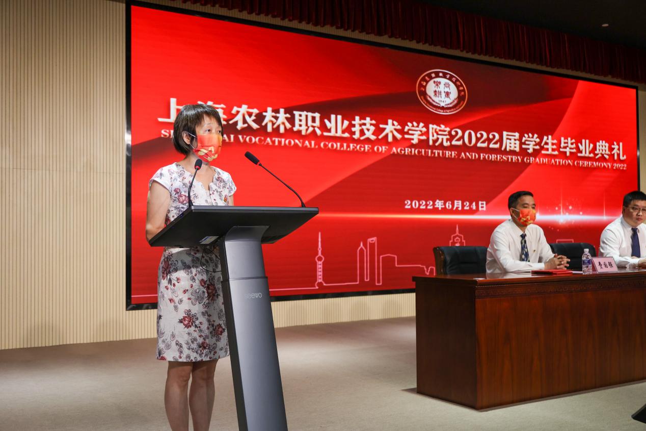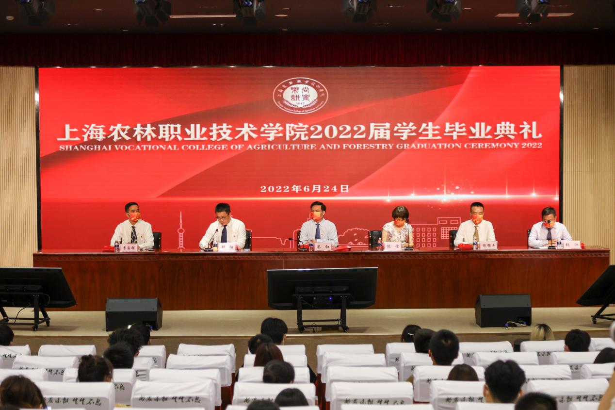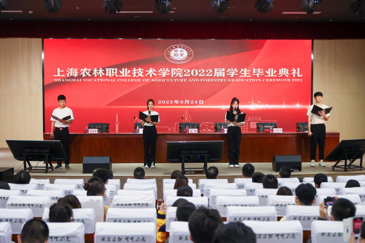 党委副书记陈谊宣读《上海农林职业技术学院2022年度优秀毕业生和2022年度上海市优秀毕业生表彰决定》,副院长张江宣读《上海农林职业技术学院关于准予2022届毕业生毕业的决定》,党政领导现场颁发上海市高校优秀毕业生、学院优秀毕业生和学生毕业证书。