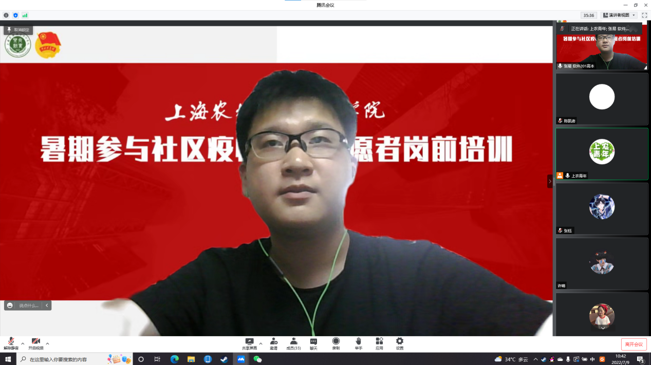按照全市常态化疫情防控志愿服务工作相关部署,进一步引导广大上农青年积极主动、规范有序、有力有效参与常态化疫情防控志愿服务工作,7月9日上午,院团委通过在线开展暑期常态化疫情防控志愿服务工作岗前培训,院团委,带队教师以及64名志愿者参加培训。