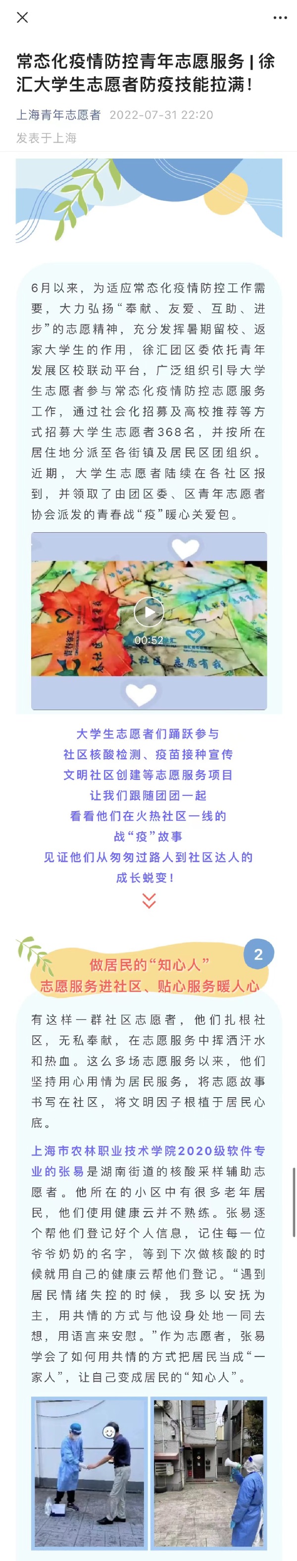 近日,上海青年志愿者微信公众号报道我院学生参与社区疫情防控事迹。报道全文如下: