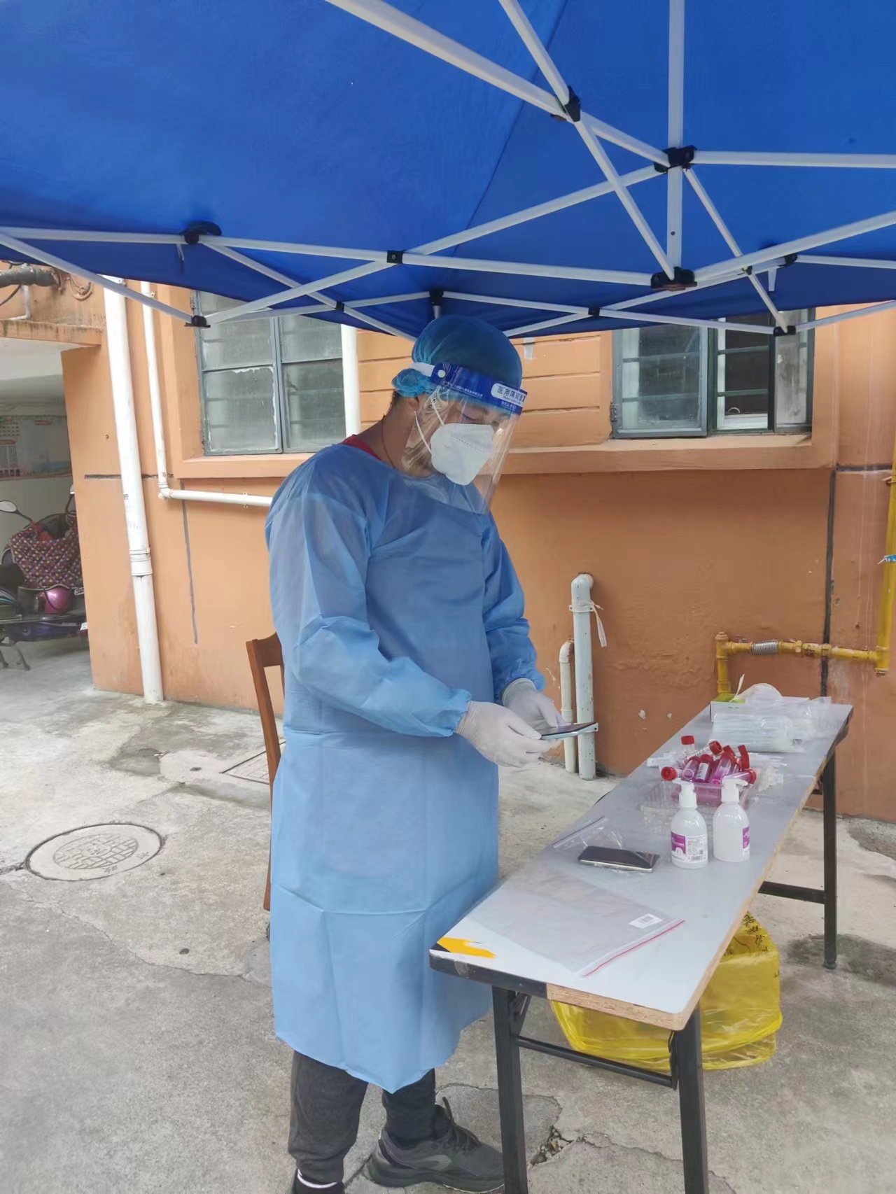 来自智慧农业工程系设施(中高贯通)181班的田思佳,自6月12号起,分别在松江区岳阳街道西新桥常态化点位进行采样、扫码以及岳阳街道社区卫生服务中心进行收样工作。这段时间温度依旧居高不下,每次服务后,她的衣服都被汗水浸湿。田思佳有感而发:“看到许多医务人员在酷暑下依旧穿着防护服工作,我深感敬佩!”