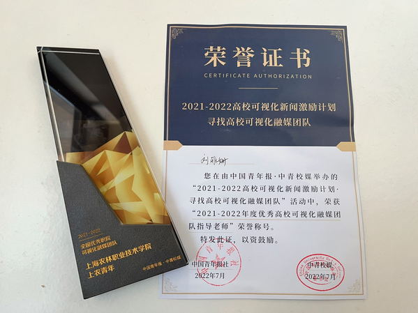 2022年,中国青年报社、中国青少年新媒体协会、中青校媒共同举办“2021-2022高校可视化新闻激励计划·寻找高校可视化融媒团队”活动,院团委“上农青年”新媒体品牌作为校园媒体参加,并荣获“2021-2022年度全国优秀职院可视化融媒团队”,刘雅姗老师获评“2021-2022年度全国优秀职院可视化融媒团队指导老师”荣誉称号。