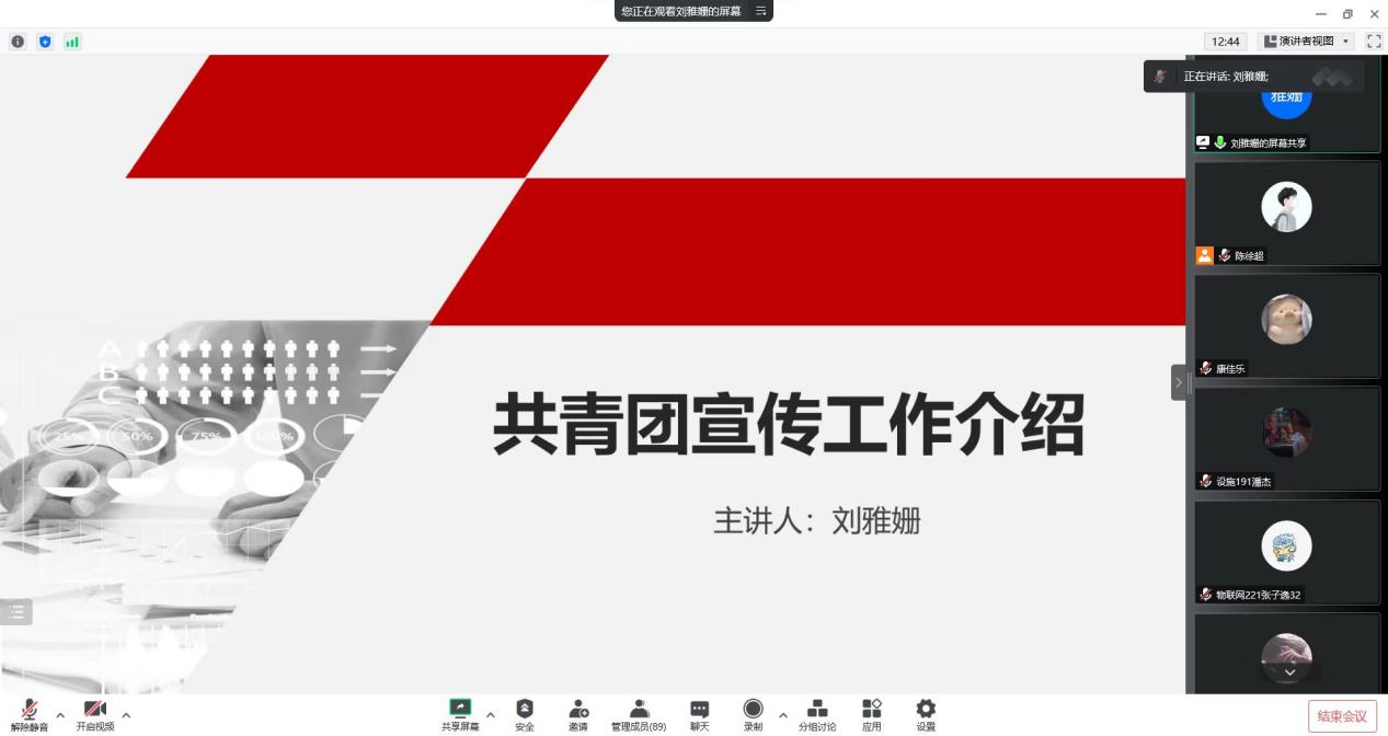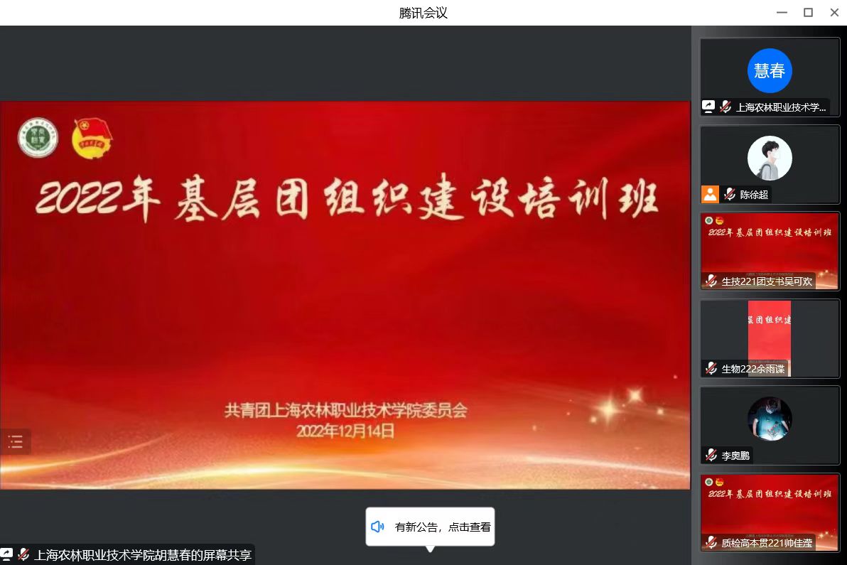 为进一步深化高校共青团改革,落实大抓基层的鲜明工作导向,强化“一切工作到支部”的工作理念,着力提升学生团干部的政治素养和业务能力,12月14日—15日,院团委在线举办“学习二十大,永远跟党走,奋进新征程”2022年基层团组织建设培训班,2021级、2022级学生团支部书记、团支部组织委员和宣传委员参加了培训。