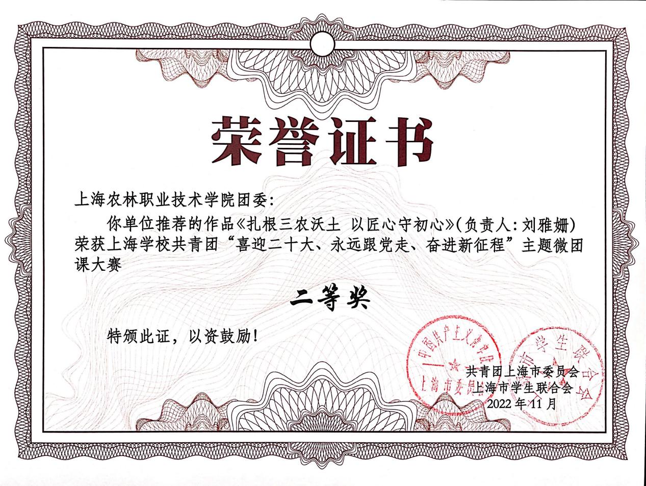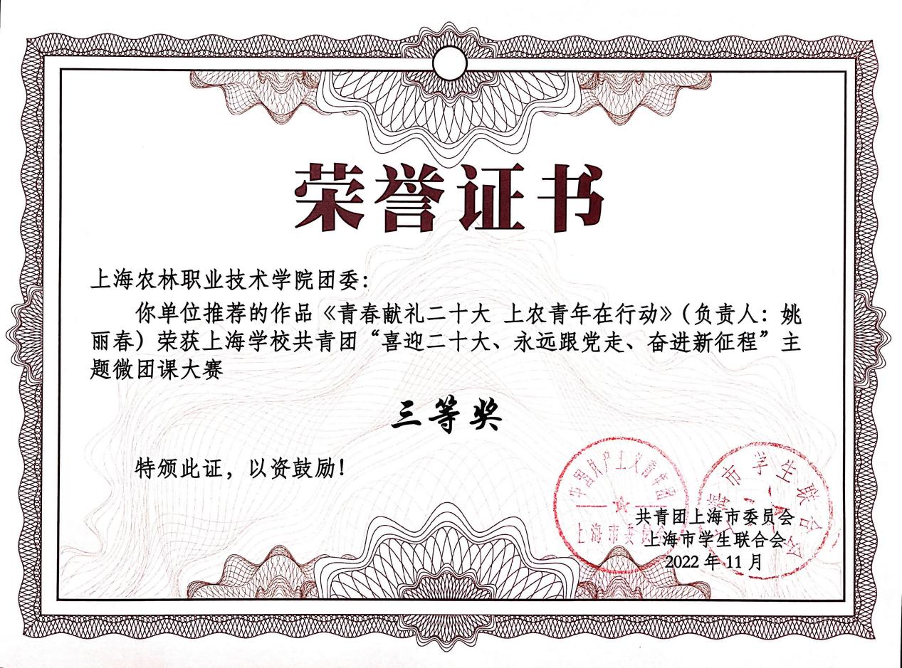 2022年11月,由共青团上海市委员会、上海市学生联合会联合举办的2022年上海学校共青团“喜迎二十大、永远跟党走、奋进新征程”主题微团课大赛落下帷幕。在全市48所高等院校、16个区64所高中阶段学校推荐的378件优秀作品中,我院刘雅姗老师作品《扎根三农沃土 以匠心守初心》荣获大赛二等奖;上农青年讲师团成员旅管191班姚丽春同学作品《青春献礼二十大 上农青年在行动》荣获大赛三等奖。