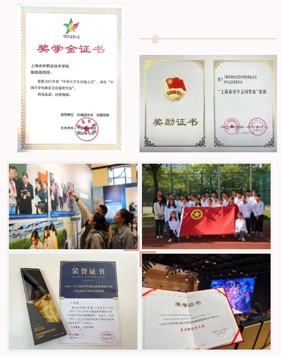积极发挥榜样示范引领,选树典型走深走实走心。充分发挥身边人、身边事榜样效应,大力培育先进典型,展现上农青年奋发有为、积极向上的精神风貌,涌现出一大批先进典型。1名同学获“中国大学生自强之星”、2名同学获“中国电信奖学金”、1名同学获“2021上海大学生年度人物提名奖”、3名同学被评为“上海市优秀共青团员”、4名同学被评为进博会“优秀志愿者”、1名同志获“上海市青年五四奖章个人”、1个集体获“上海市青年五四奖章集体”、1个集体获“第四届中国国际进口博览会志愿服务先进集体”,千余名个人和集体获校级各项荣誉。