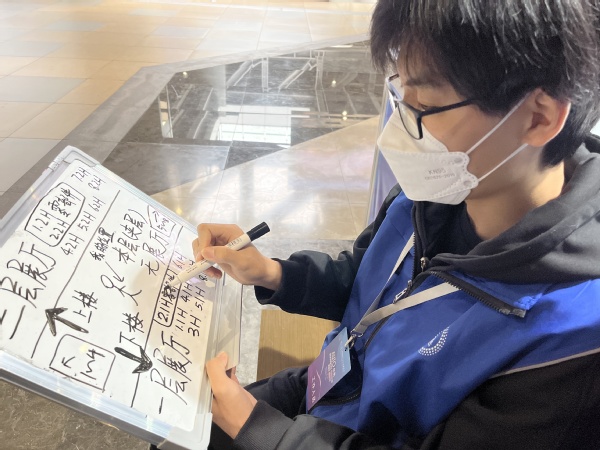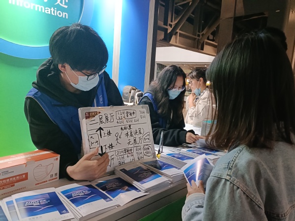 今年是上农学子郭王宇第一次担任车展志愿者,此次他站岗的地方位于国家会展中心二楼夹层咨询台。郭王宇告诉记者,因为7号咨询台距离地铁出口较近,人流量大,位置处于8米层,属于整个展馆的中间夹层,需要向上或向下才能到达展区,因此,很多不熟悉路线的观众都会第一时间来到咨询台问询路线,志愿者高密度地回答几乎相同的问题。所以,他就琢磨是否有什么方式能够快速让观众了解情况,减轻志愿者的压力。