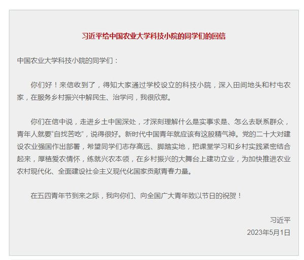 习近平总书记给中国农业大学科技小院的学生回信强调:厚植爱农情怀练就兴农本领在乡村振兴的大舞台上建功立业,在五四青年节到来之际,向全国广大青年致以节日的祝贺。