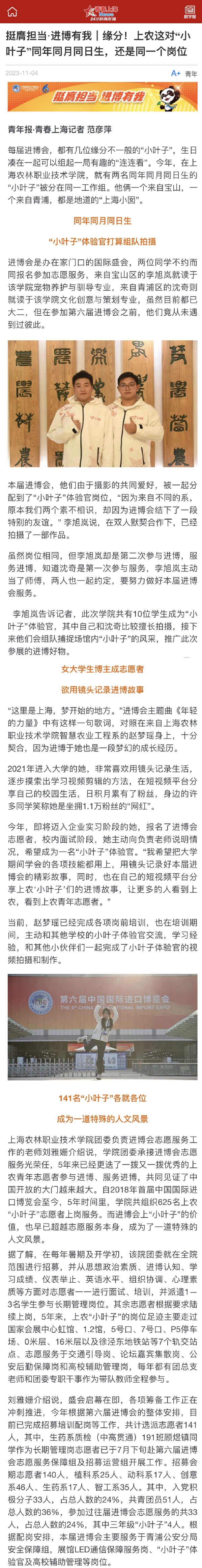 近日,青年报报道我院3名第六届进博会志愿者事迹。报道全文如下: