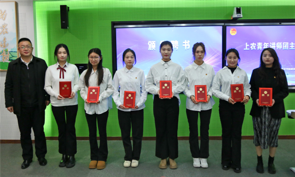 活动中,邵阳为讲师团成员颁发聘书并发表致辞讲话,他指出上农青年讲师团开展主题宣讲,承担着组织宣讲习近平新时代中国特色社会主义思想的重大任务,希望讲师团进一步做好理论宣讲工作,要聚焦主责主业、凝聚人心力量、增强宣讲的思想性、针对性、生动性,让普通青年学生听得懂、能领会、可落实,扩大在广大同学中的宣传示范效应。