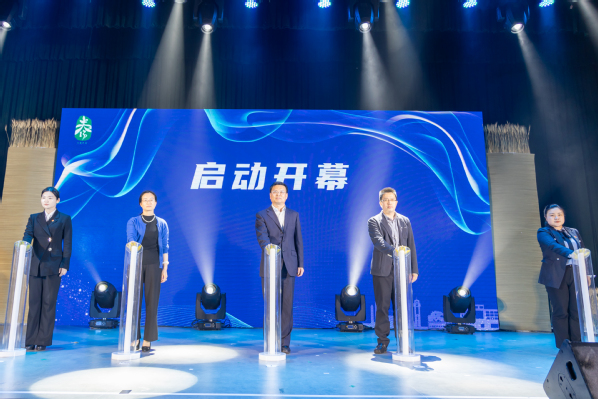 蔡红与马骏、周薇、施佩丽、朱佳乐共同启动本届文化科技节开幕仪式。