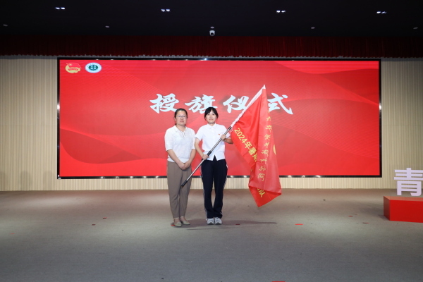 党委学工部部长高东菊为暑期社会实践重点团队代表授旗。