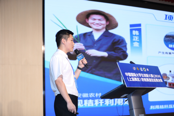 马建超、赵猛为决赛评委颁发聘书。同济大学创新创业学院副院长殷俊峰和我院植物科学技术系园艺221班韩正金分别代表全体评委和参赛选手进行宣誓。