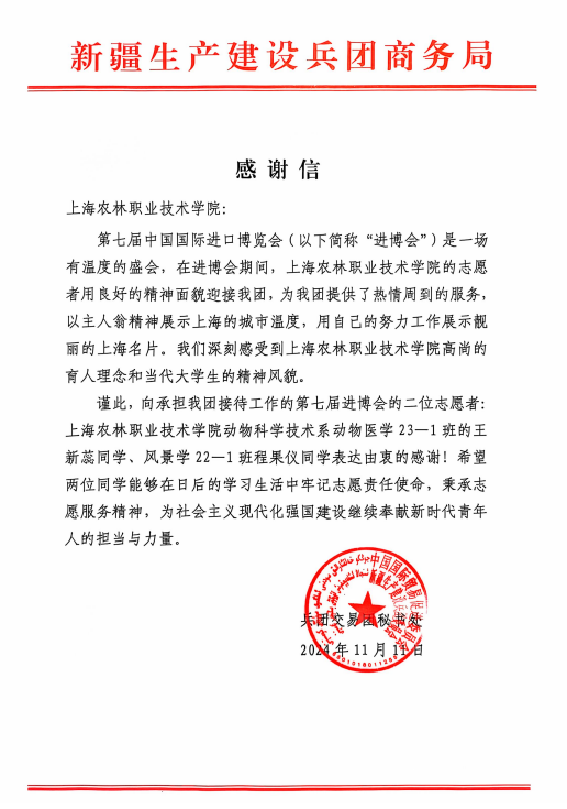 近日,学院收到来自新疆生产建设兵团商务局(以下简称兵团)的感谢信。兵团在信中充分赞扬了学院动物科学技术系动物医学231班的王新蕊、数字经济与创意系风景221班程果仪两位同学在进博会接待任务中的工作表现,肯定了学院的育人理念和志愿者精神风貌。