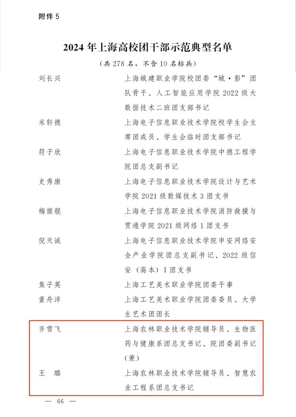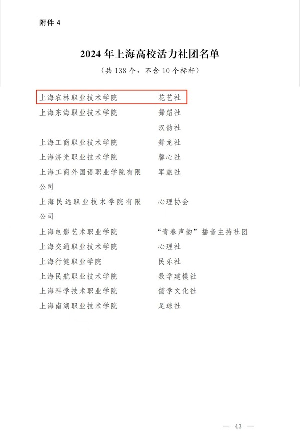 为表扬先进、树立典型,进一步增强示范引领,持续激发高校、高中阶段学校基层团组织、社团、团干部活力,共青团上海市委员会、上海市教育委员会于今年3月启动2024年度上海高校、高中阶段学校活力团组织、活力社团、团干部典型遴选活动。共青团上海市委员会、上海市教育委员会于近日发布《关于表扬2024年度上海高校、高中阶段学校活力团组织、活力社团、团干部示范典型的决定》,我院动物科学技术系团总支被评为2024年上海高校标杆活力团 (总)支部,花艺社被评为上海高校活力社团,齐雪飞、王璐被评为上海高校团干部示范典型。