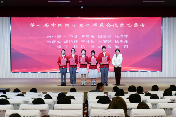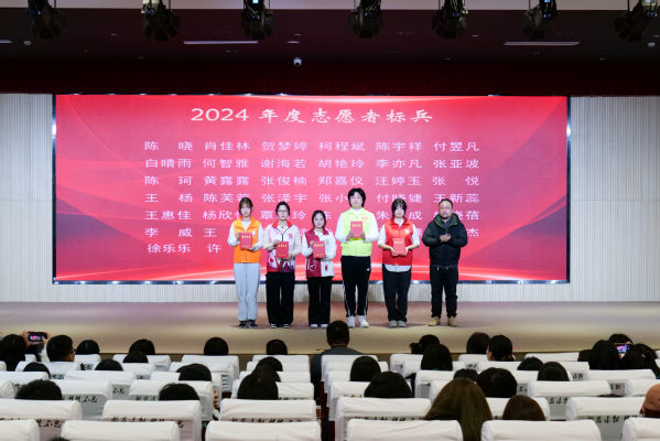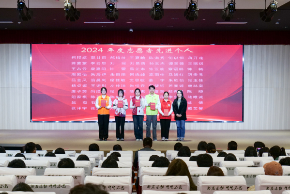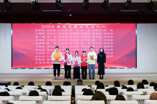 学工部副部长张莎莎宣读表彰决定。授予陈晓等40人2024年度志愿者“标兵”称号,授予柯程斌等141人2024年度志愿者“先进个人”称号,授予朱中豪等15人第七届中国国际进口博览会“优秀志愿者”称号,授予上农轨道交通志愿者服务队等6个志愿服务团队 2024 年度“志愿服务先进集体”称号,授予阳光之家志愿服务项目等5个志愿服务项目2024年度“优秀志愿服务项目”称号,授予崔鹏展等7人2024 年度“志愿服务优秀指导教师”称号。各系学生工作负责人为获奖师生颁奖。