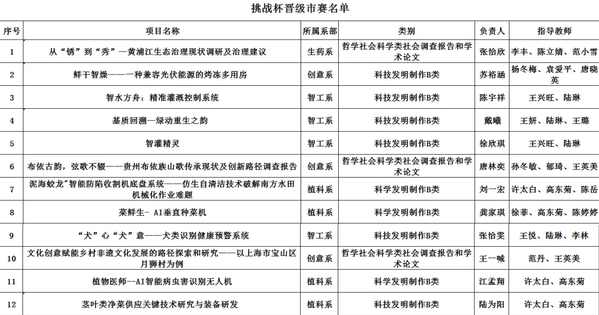 根据《关于举办第十九届“挑战杯”全国大学生课外学术科技作品竞赛上海农林职业技术学院校内选拔赛的通知》,结合选拔赛、决赛各项目团队表现及专家意见,秉承公开、公平、公正的原则,推荐12个项目参加上海市比赛,具体名单如下: