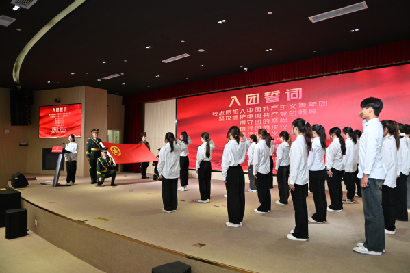 团委挂职副书记赵琳娜老师带领新发展团员宣誓。全体新团员面向团旗庄严宣誓,用铿锵誓言表达对共青团的忠诚与为共产主义事业奋斗的决心。