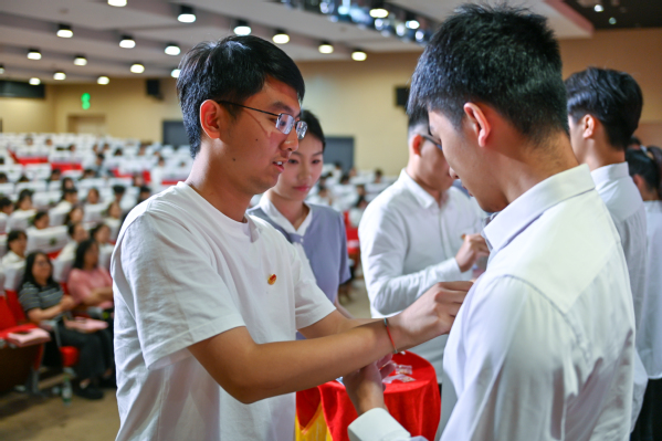 示范性入团仪式在庄严的国歌声中正式开始。在入团仪式中,主持人网络231班李子琳宣布了新团员名单,阐释入团仪式的重要意义。各系团总支书记为新团员佩戴团徽、颁发团员证,引导新团员强化身份意识,增强责任感和使命感。