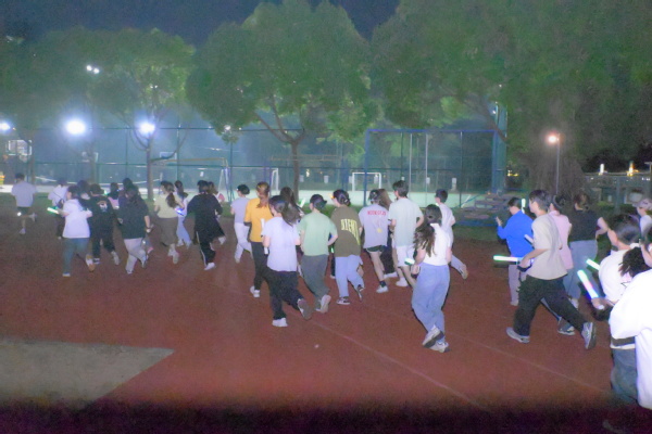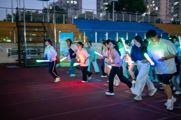 此次表白跑活动设置为3个项目环节,分别为荧光单人夜跑、单人赛和接力赛。在荧光单人夜跑中,来自不同年级和系部的近百名同学准时集合,脸上洋溢着兴奋与期待,充分热身,为跑步做好准备。随着起跑提示音的响起,同学们手持荧光棒如离弦之箭般冲出起跑线。夜幕下,荧光闪烁,大家互相加油打气,鼓励助威。