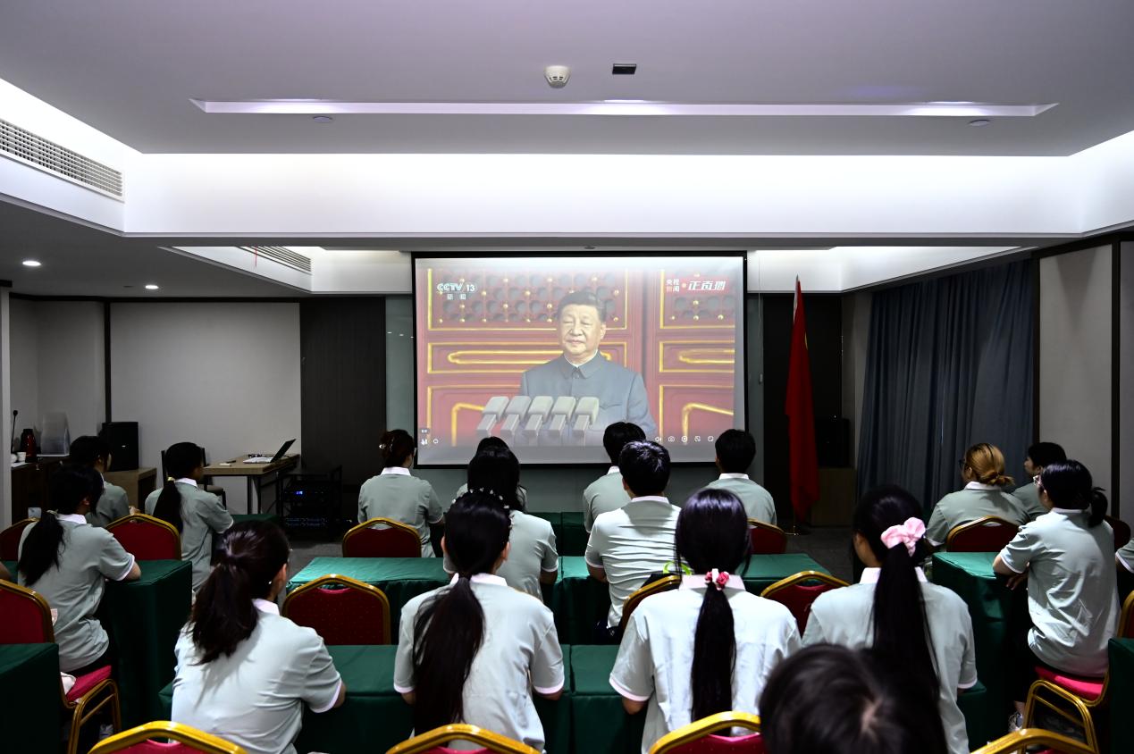 9月3日上午,全体骨干集中观看纪念中国人民抗日战争暨世界反法西斯战争胜利80周年阅兵仪式直播。屏幕上,整齐划一的受阅方阵、现代化的国防装备、昂扬向上的军人风貌,生动展现了中国的强盛国力与强军风采。观看过程中,骨干们神情肃穆、心潮澎湃。院学生会执行主席农经241王语彤表示:“观看纪念中国人民抗日战争暨世界反法西斯战争胜利80周年的九三阅兵仪式,我的内心深受震撼。阅兵式中,徒步方队的‘一老一新’设计让我印象深刻。这不仅是抗战老部队与新质战斗力的展示,更是对抗战精神的传承。当看到那些与我年龄相仿的年轻军人挺拔的身姿时,我思考着自己该如何在专业领域深耕细作,将个人成长融入国家发展需要。”学院易班学生工作站学生骨干园艺241的彭天昊同学表示:“阅兵仪式让我们直观感受到今日和平的来之不易,这是无数革命先烈用鲜血和生命换来的。作为新时代青年,我们必须铭记历史、缅怀先烈,以更强的责任感和使命感为国家发展、民族复兴贡献青春力量。”