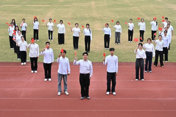 仪式接近尾声时,全场师生共同挥动手中的红旗,齐声合唱《歌唱祖国》。激昂的旋律、嘹亮的歌声回荡在校园上空,不仅是对祖国华诞的深情礼赞,更展现出我院师生团结奋进、昂扬向上的精神风貌,进一步增强了大家的爱国主义情怀与民族自豪感。团员青年们身着整齐的白衬衣,胸挂团徽,精神抖擞地挥舞着手中的国旗,排成心形队形,以青春之名传递爱国情怀,用实际行动为祖国华诞献上真挚祝福。