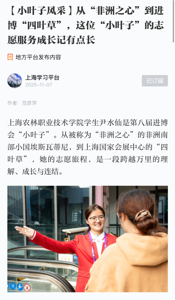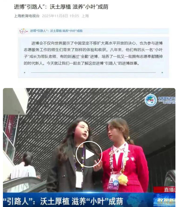 从凌晨4点的接驳车调度到现场突发状况的精准应对,从“带队冲锋”的一线服务到“支撑全局”的幕后保障,上农“小叶子”用行动诠释了“奉献、友爱、互助、进步”的志愿精神,他们的故事被学习强国、上海教育青年报等媒体广泛报道,成为进博会上最动人的风景线。
